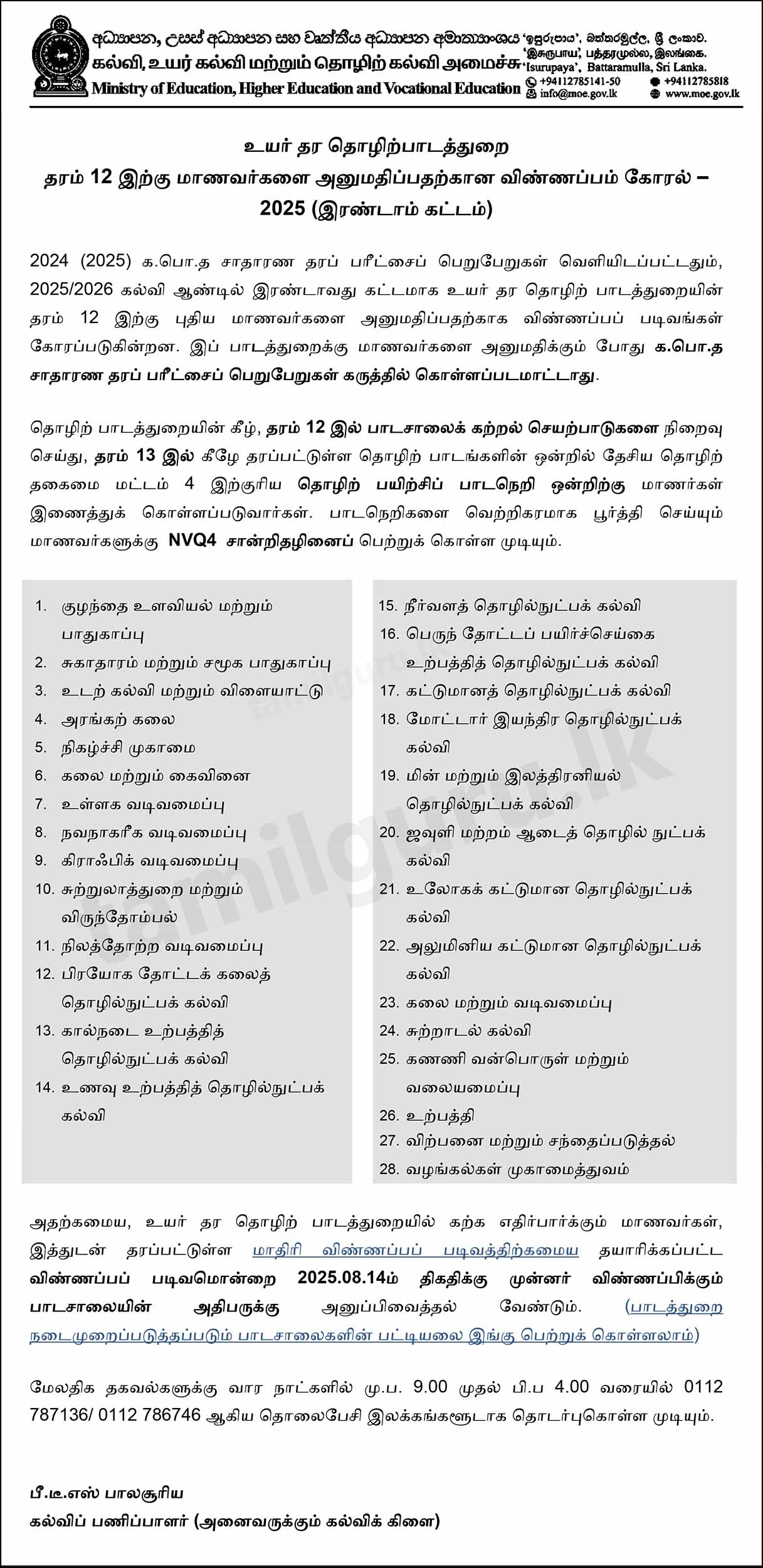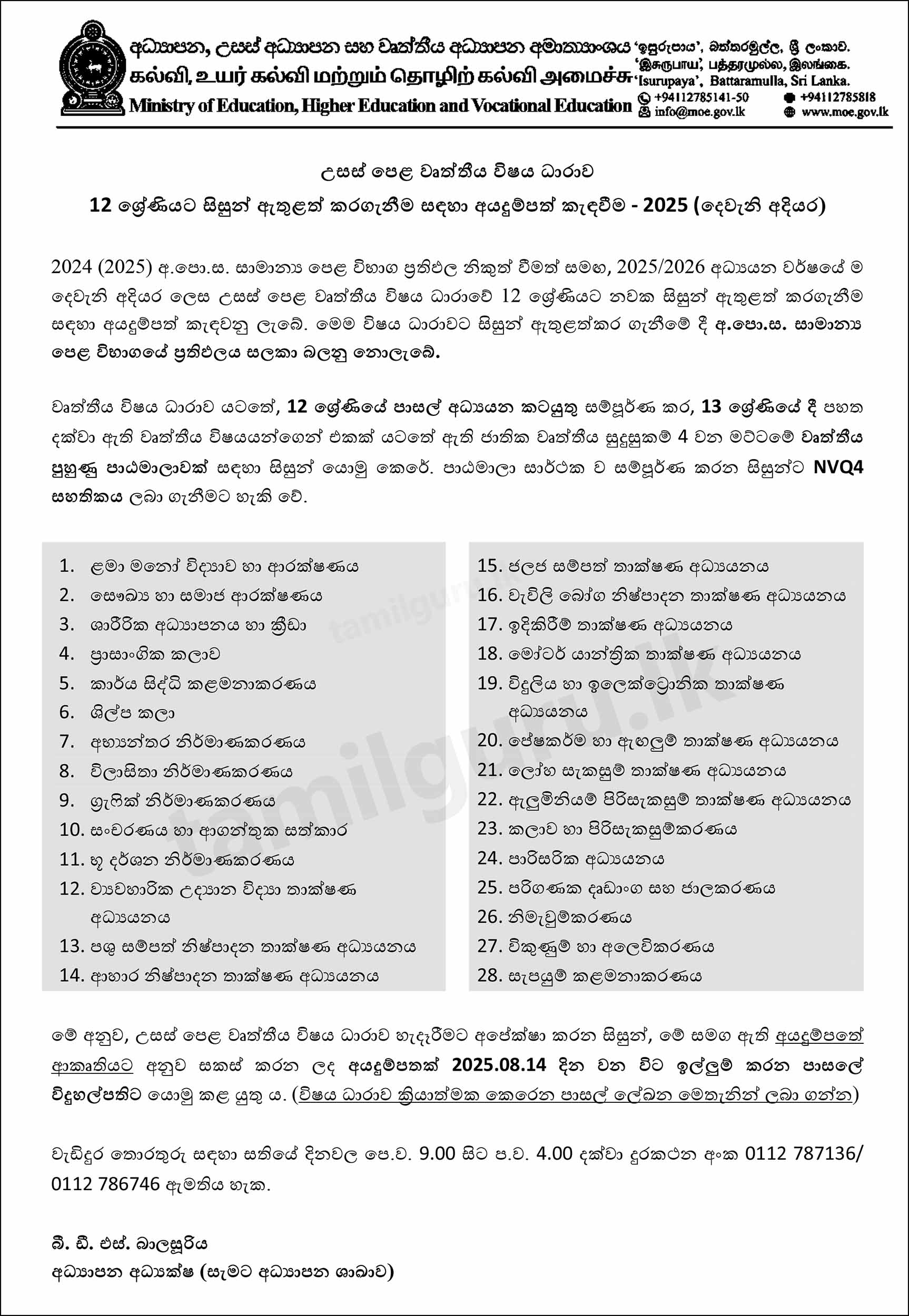 Calling Applications for Admission to GCE A/L Vocational Stream (Grade 12) (Thirteen Years Guaranteed Education Programme) 2025/2026 (Second Phase) – Ministry of Education