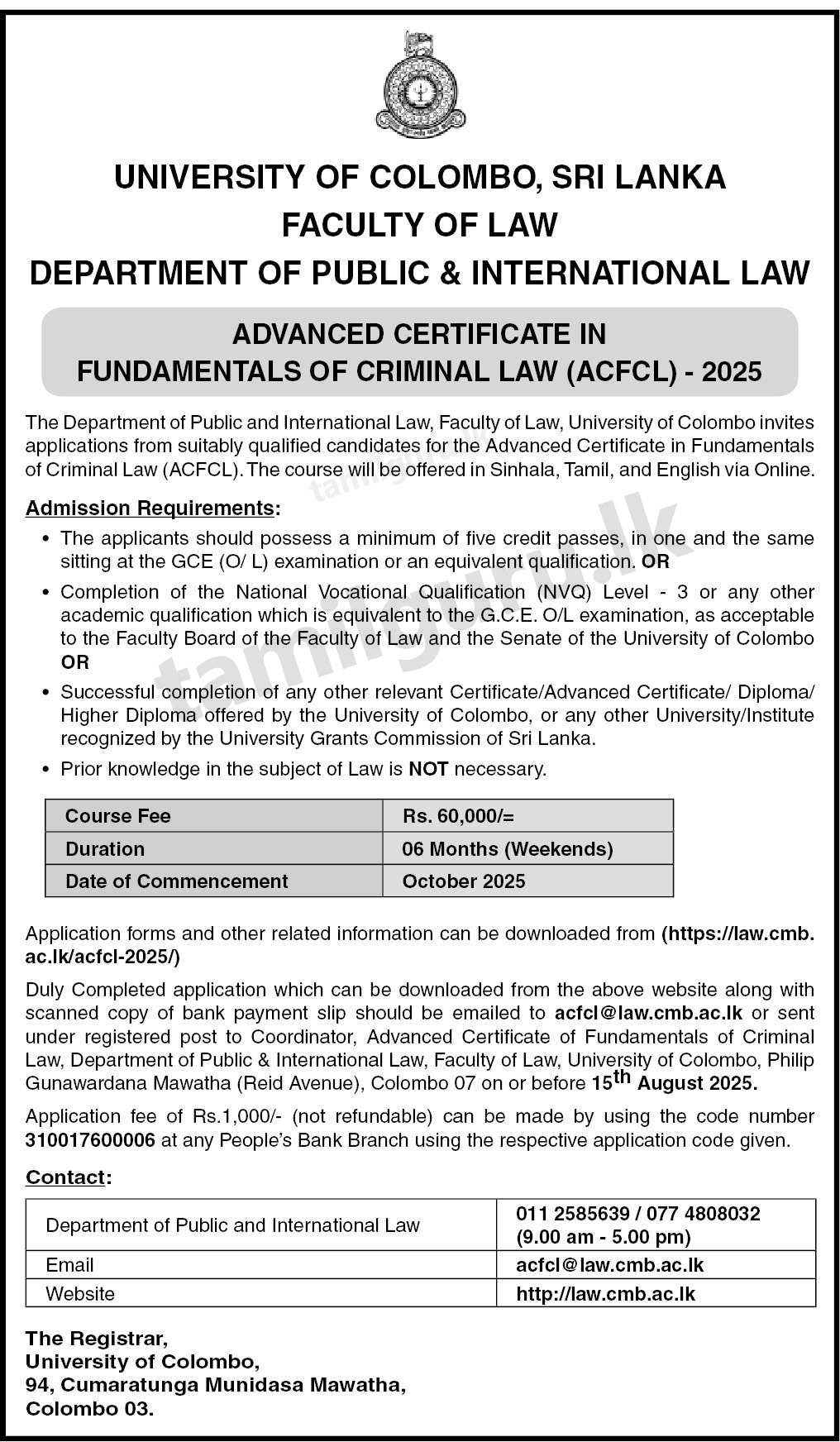 Advanced Certificate in Fundamentals of Criminal Law (ACFCL) 2025 - University of Colombo