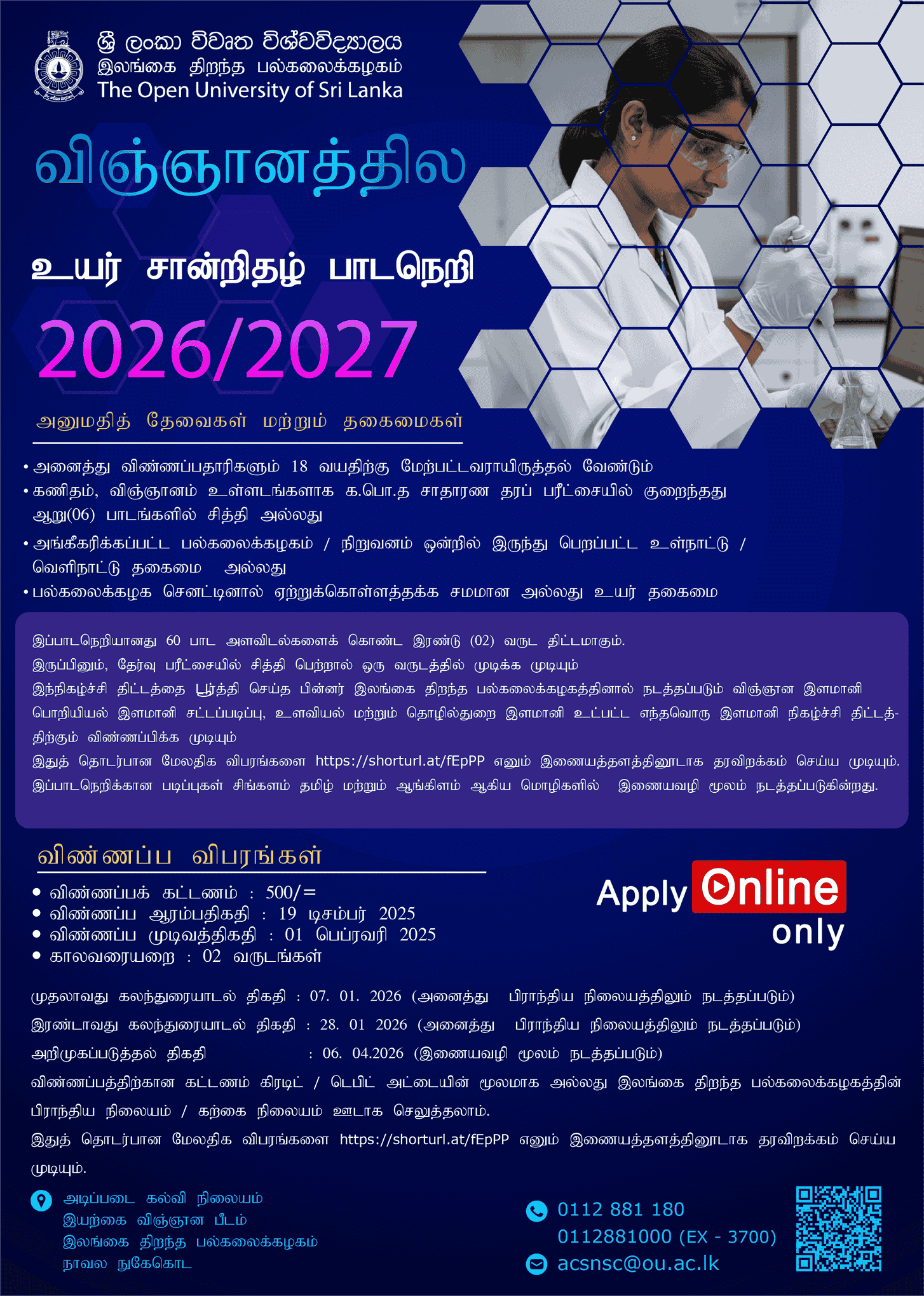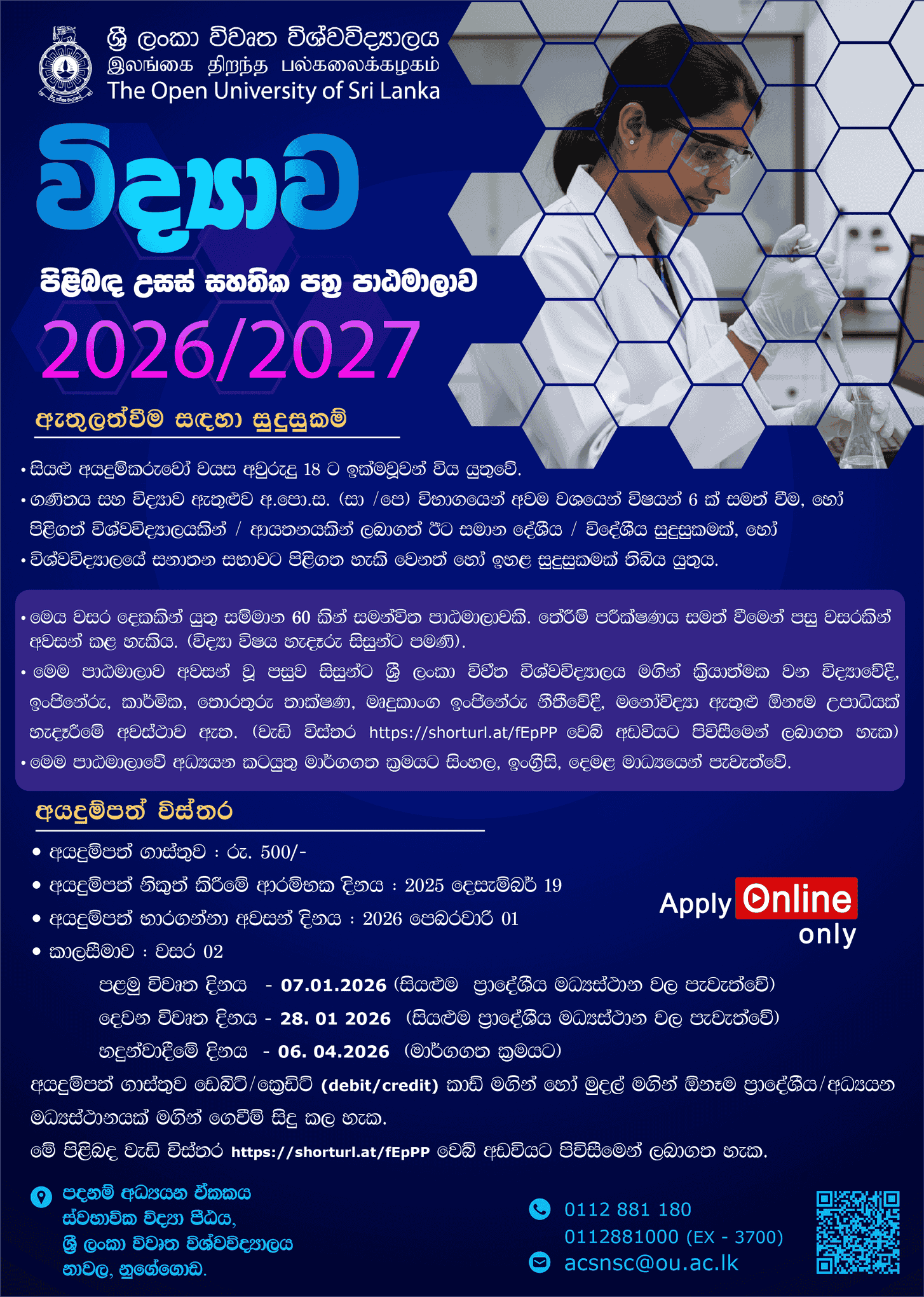 Calling Applications for Advanced Certificate in Science (Foundation Courses for Science & Engineering Degree Programmes) 2026/2027 Conducted by The Open University of Sri Lanka (OUSL)