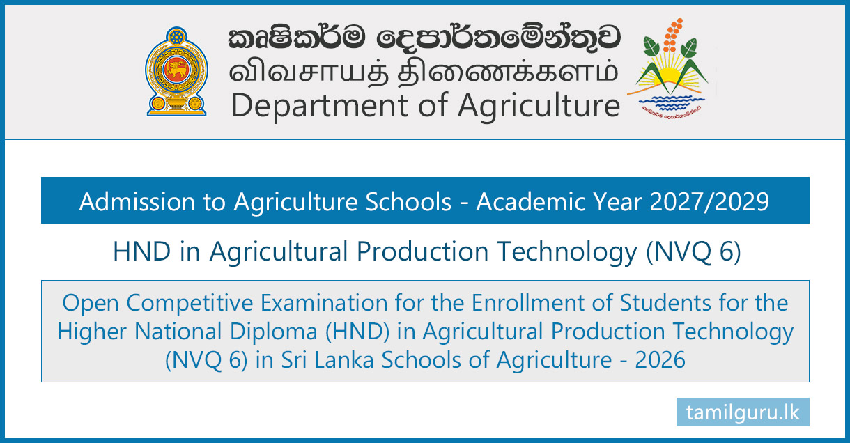 Applications are now invited for the Open Competitive Examination for the enrolment of students to follow the Higher National Diploma in Agricultural Production Technology (NVQ Level 6) at Sri Lanka Schools of Agriculture for the Academic Year 2027/2029.