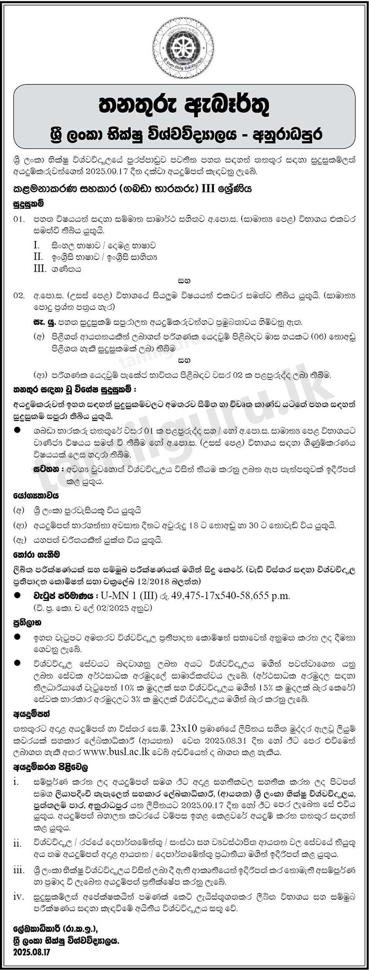 Job Vacancies at Bhiksu University of Sri Lanka (BUSL) – 2025 August / September
