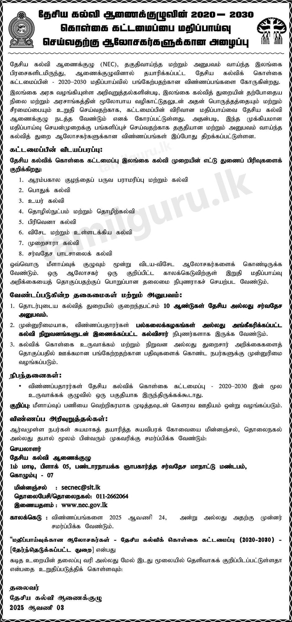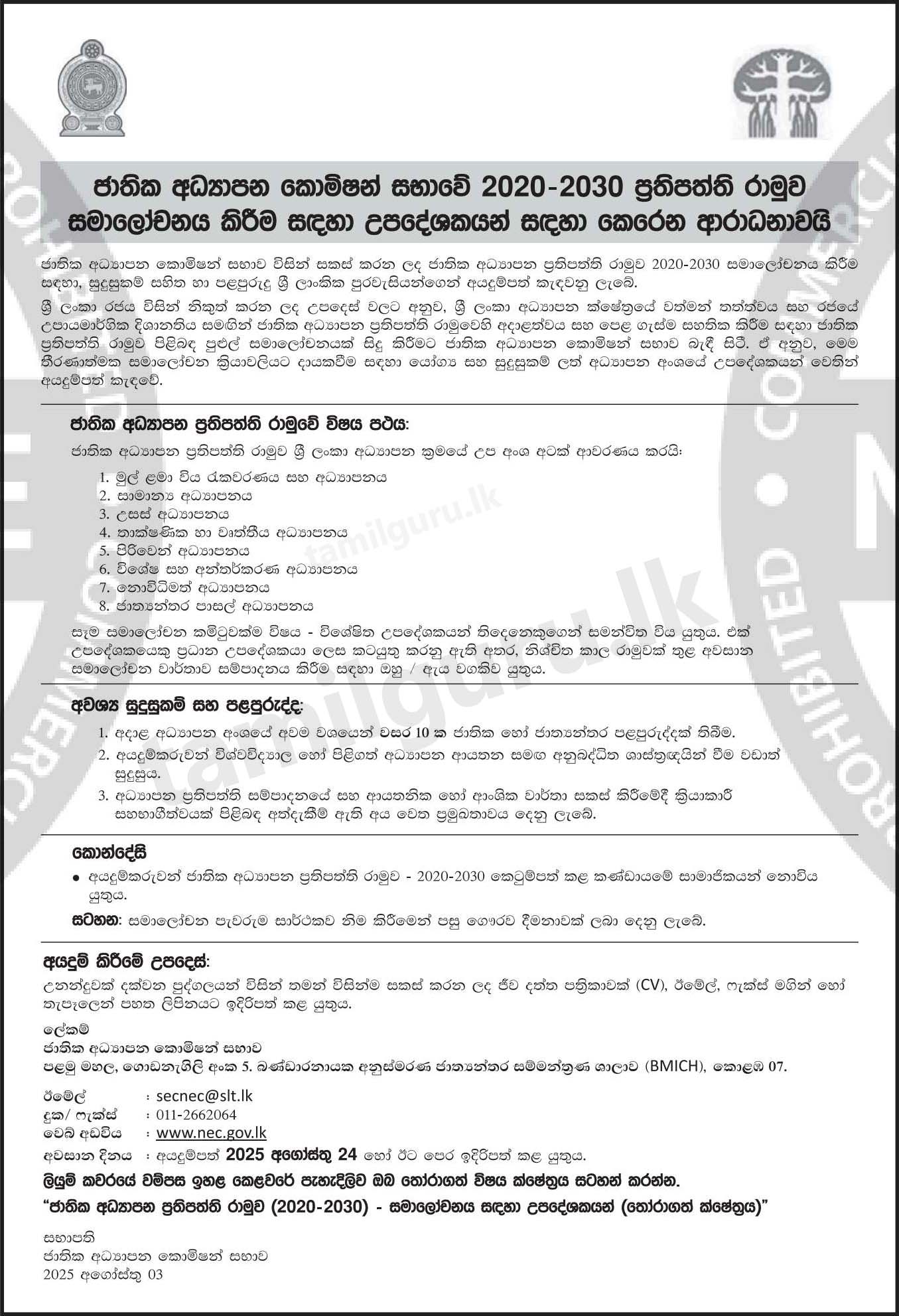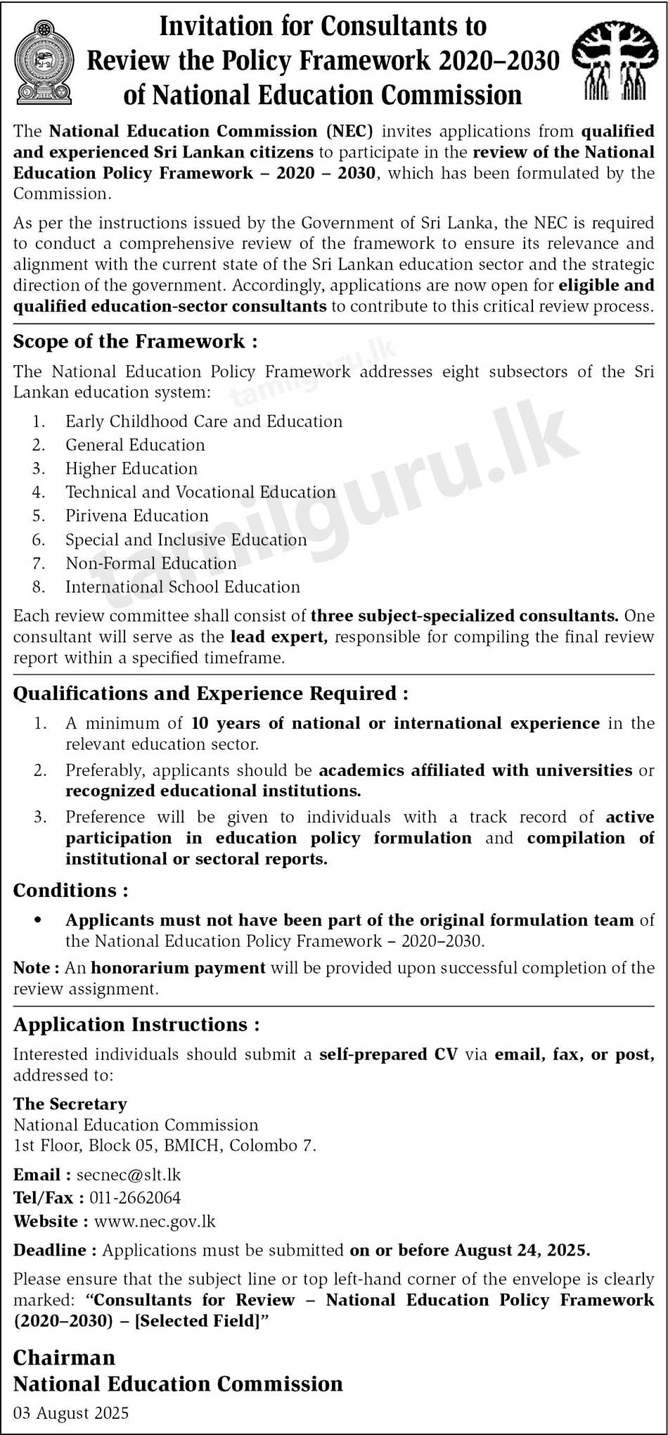 The National Education Commission (NEC) invites applications from qualified and experienced Sri Lankan citizens to participate in the review of the National Education Policy Framework – 2020-2030, which has been formulated by the Commission.