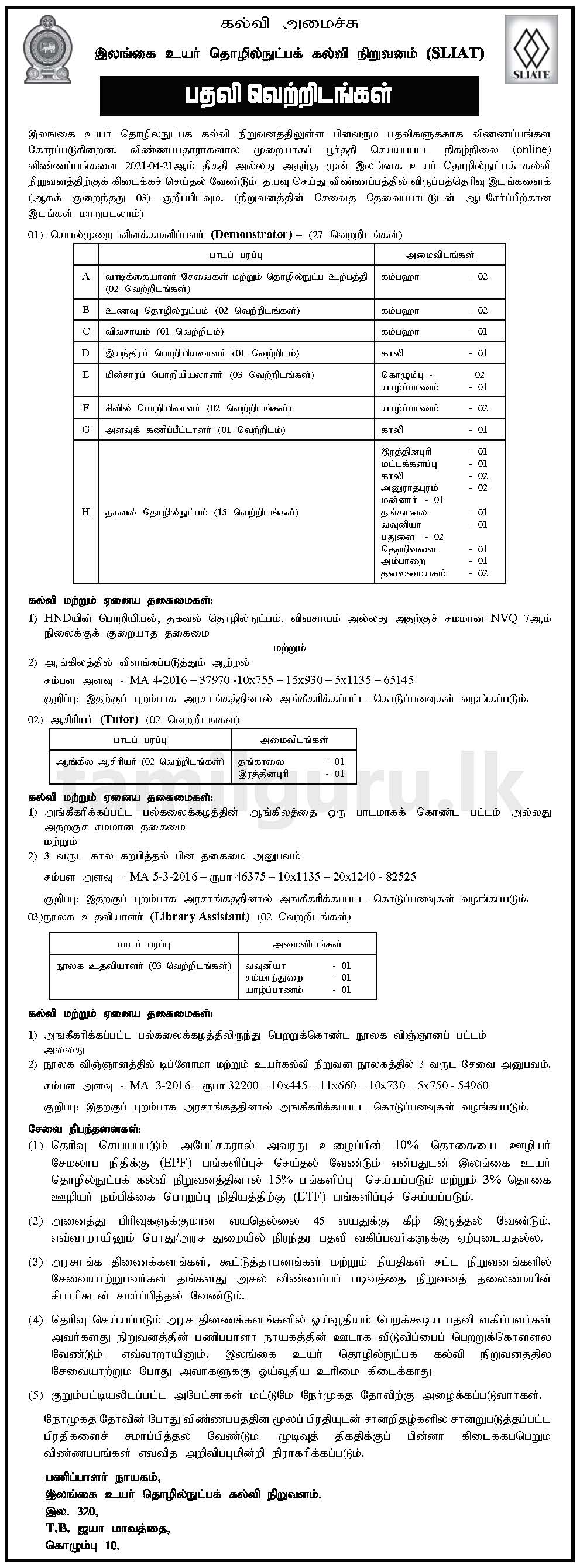 Calling Online Applications for Following Vacancies at SLIATE – (http://www.sliate.ac.lk/app/forms/recruitments/)