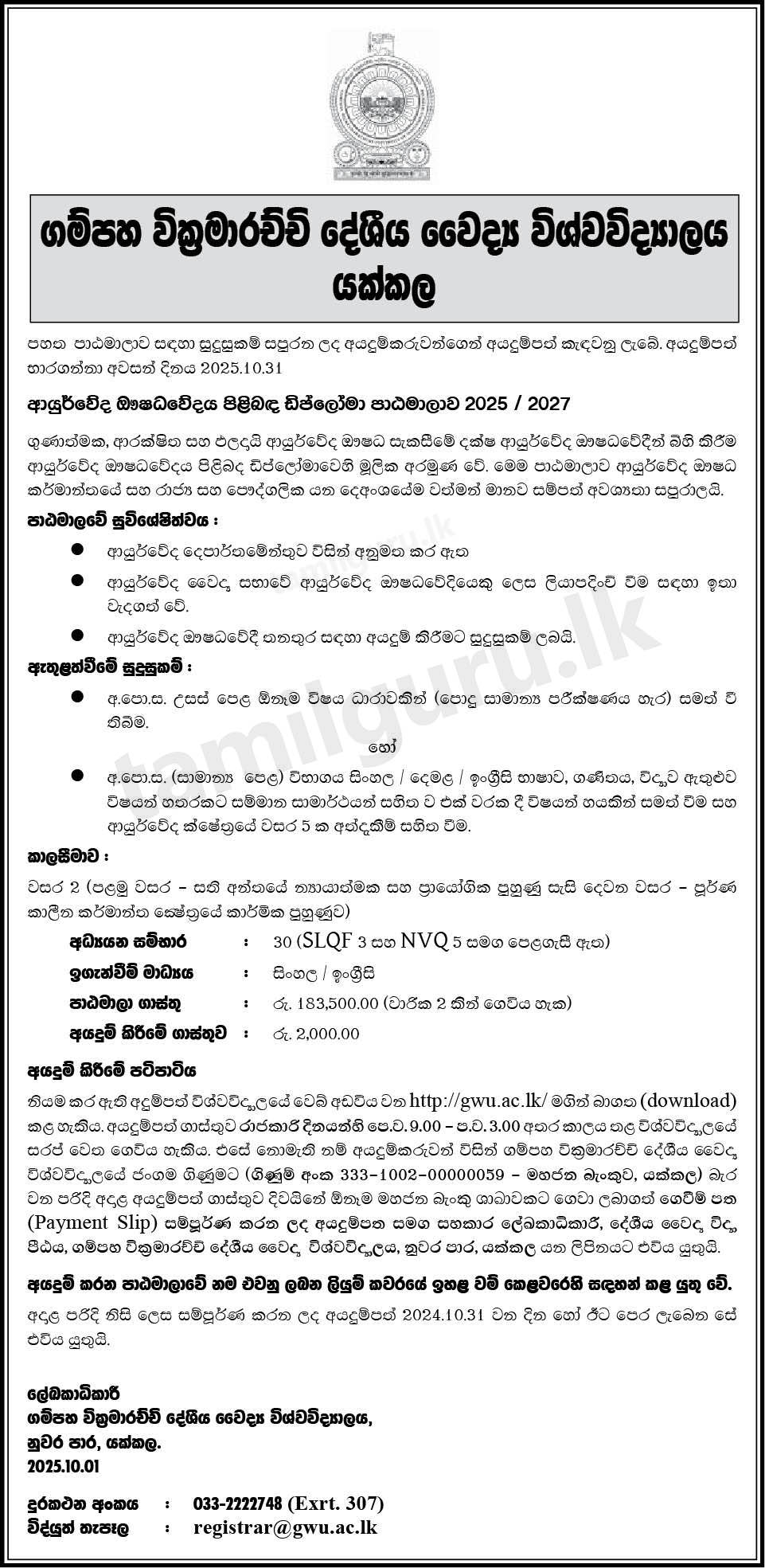 Calling Applications for Diploma in Ayurveda Pharmacy (Intake 2025/2027) Conducted by the Gampaha Wickramarachchi University of Indigenous Medicine (GWUIM)