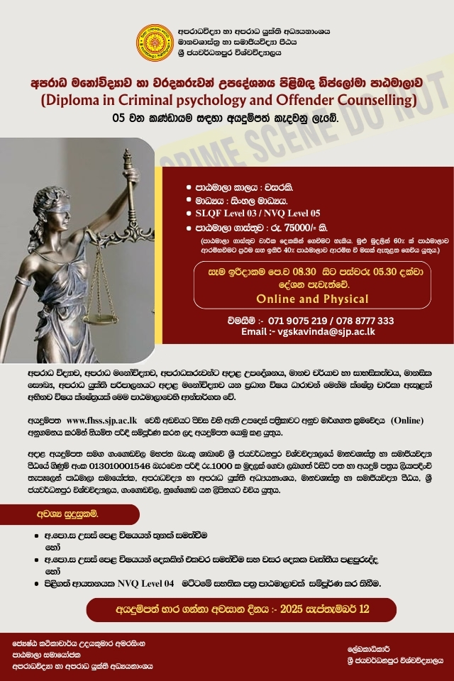 Calling Applications for Diploma in Criminal Psychology and Offender Counseling (Intake 2025) Conducted by the Department of Criminology and Criminal Justice, Faculty of Humanities and Social Sciences, University of Sri Jayewardenepura