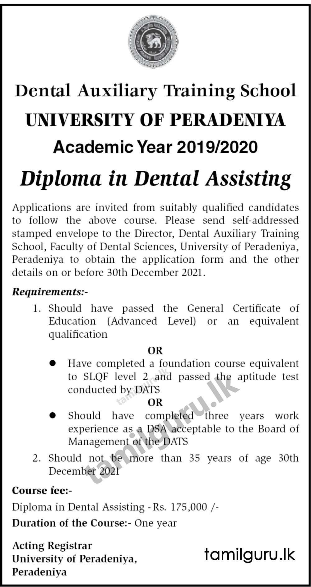 Diploma in Dental Assisting 2021 - University of Peradeniya