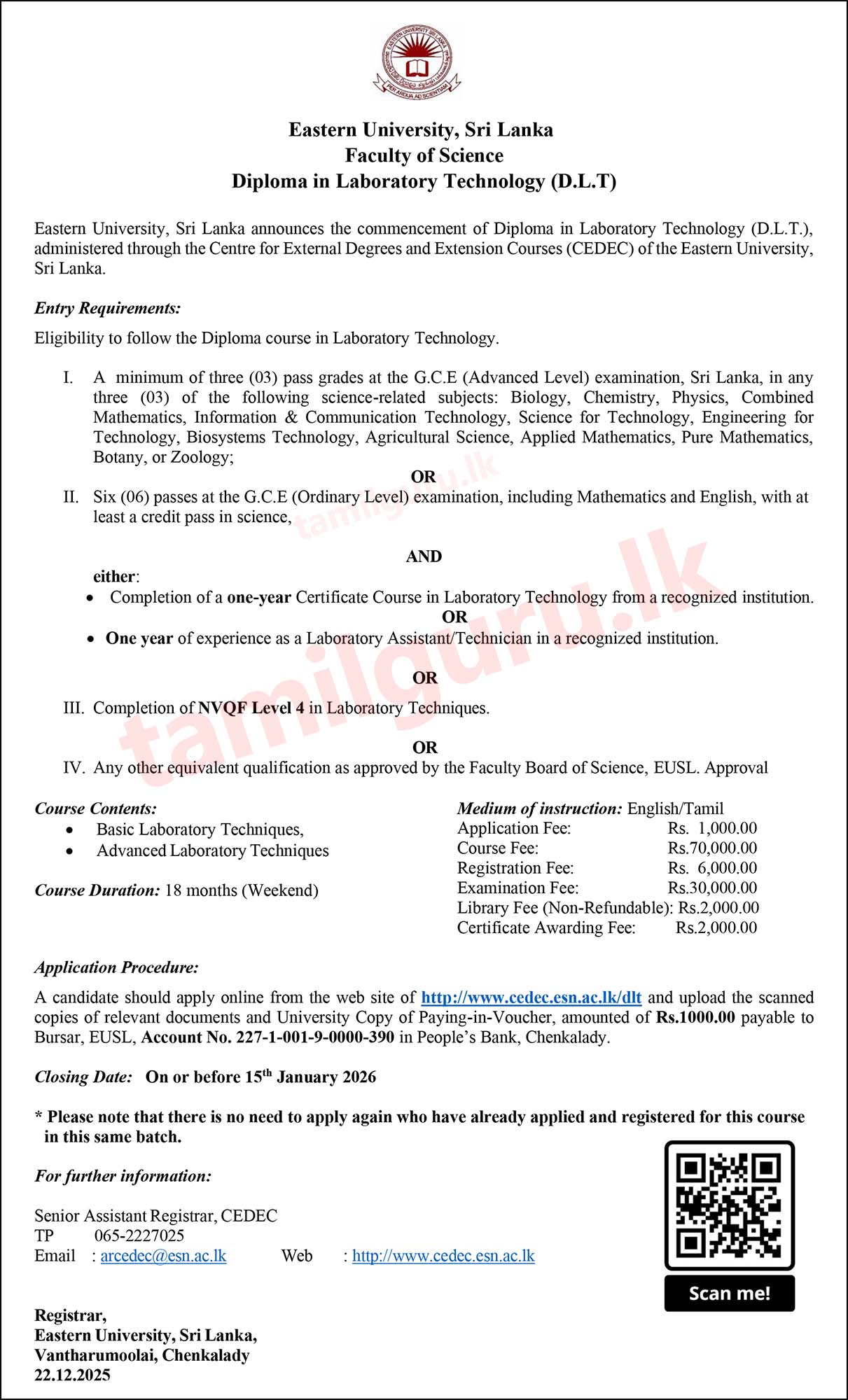 Calling Applications for Diploma in Laboratory Technology (DLT) Intake 2025/26 Conducted by Eastern University, Sri Lanka (EUSL)