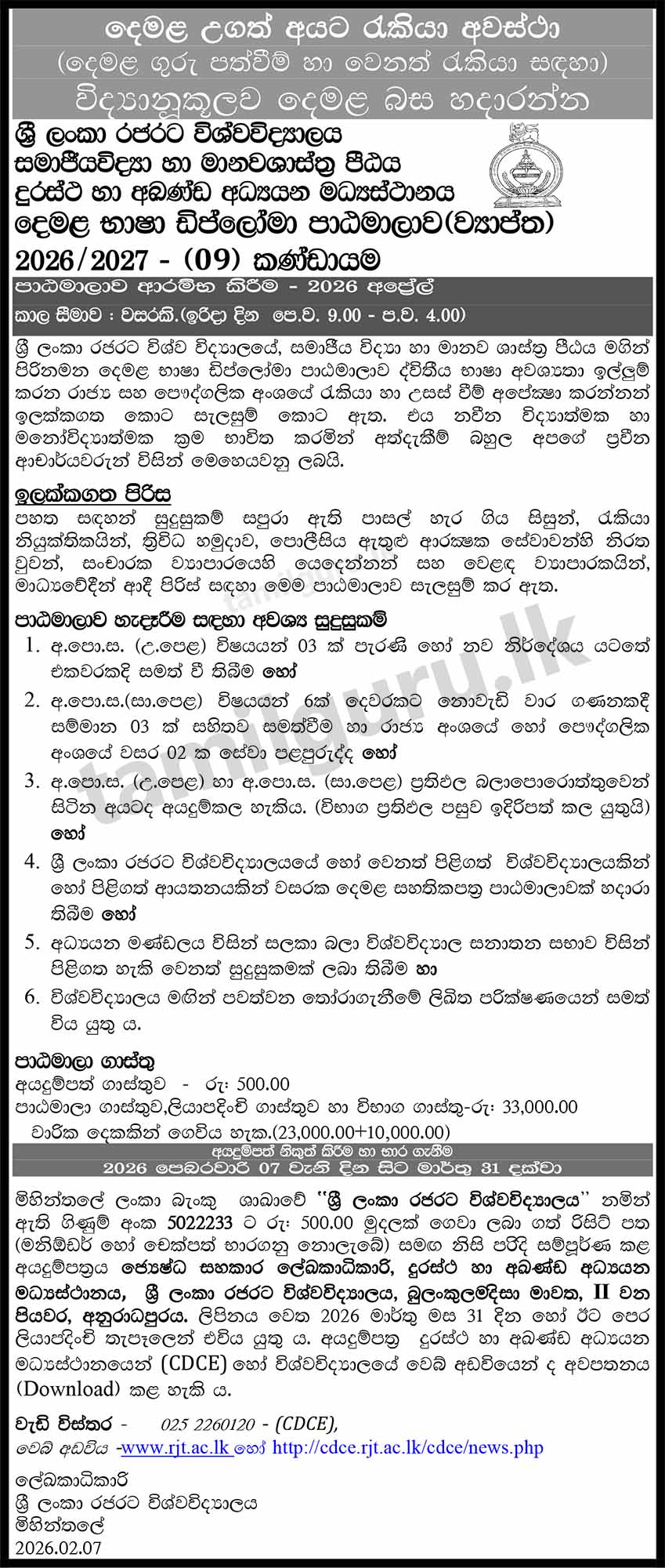 Calling Applications for Diploma in Tamil Language 2026/2027 (09th Batch) Conducted by Rajarata University of Sri Lanka (RUSL)