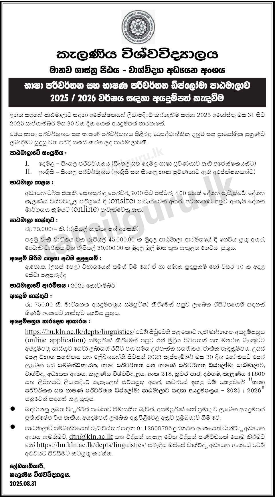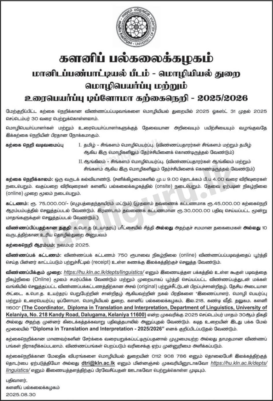Calling Applications for Diploma in Translation and Interpretation Course (2025/2026 Intake) Conducted by the Department of Linguistics, University of Kelaniya