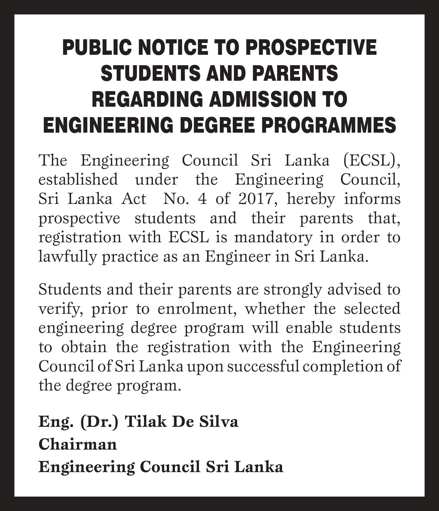 ECSL states that registration with the Engineering Council Sri Lanka is mandatory for anyone who wishes to lawfully practice as an Engineer in Sri Lanka. Therefore, students are strongly advised to verify whether their selected engineering degree programme will allow them to obtain ECSL registration after graduation.