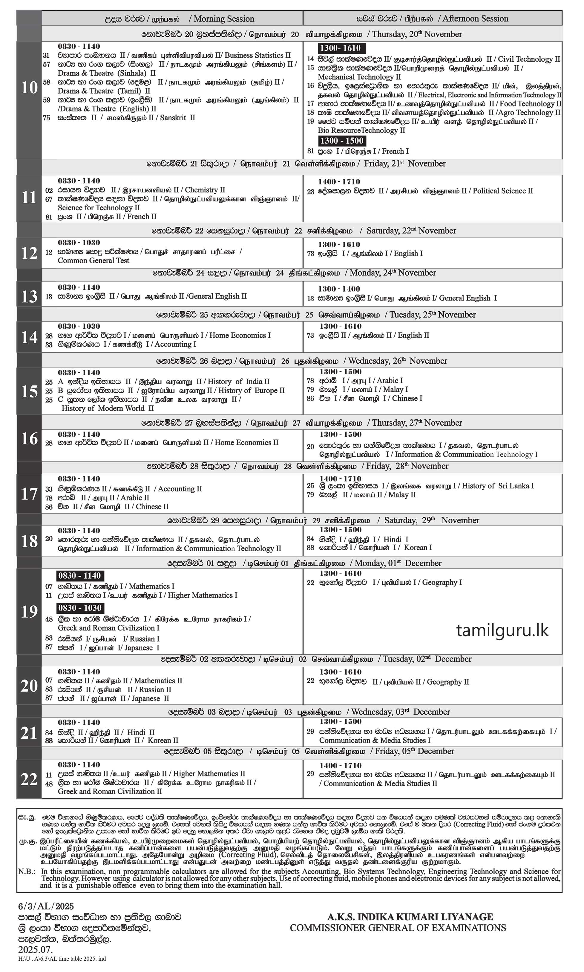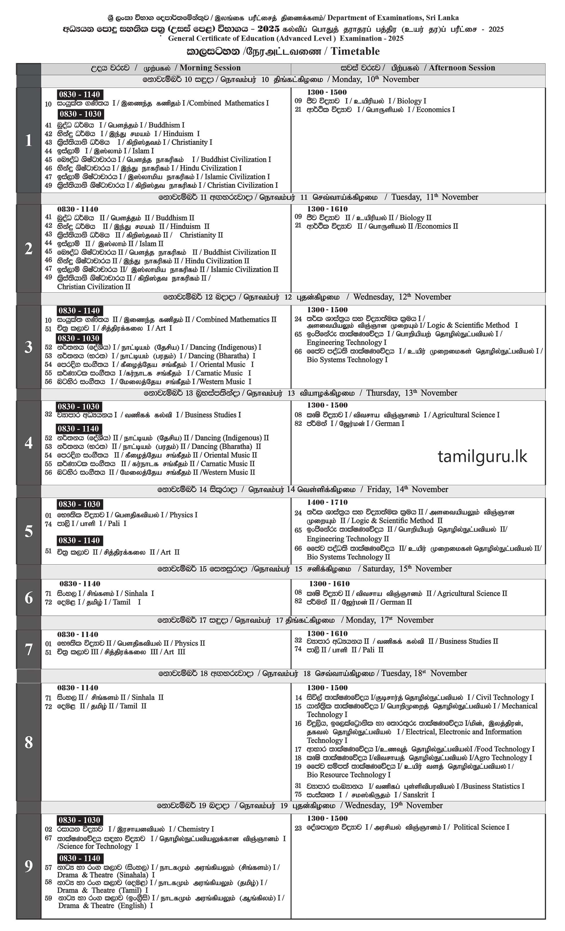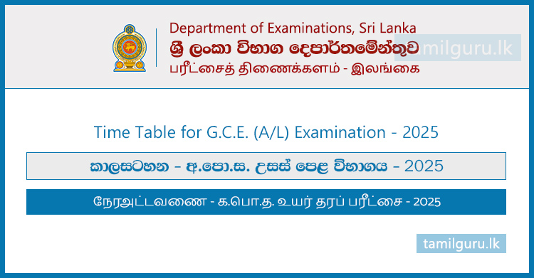 The Department of Examinations has released the Time Table of the GCE A/L Examination 2025