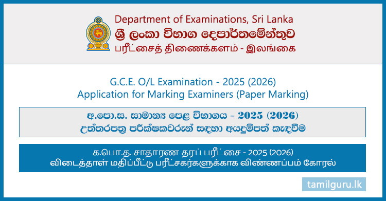 The Department of Examinations calls for applications for the Selection of Marking Examiners (Paper Marking for the G.C.E. Ordinary Level (O/L) Examination 2025 (2026) which is to be conducted in February 2026.