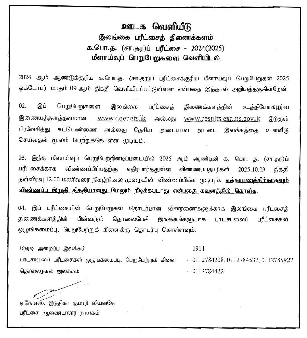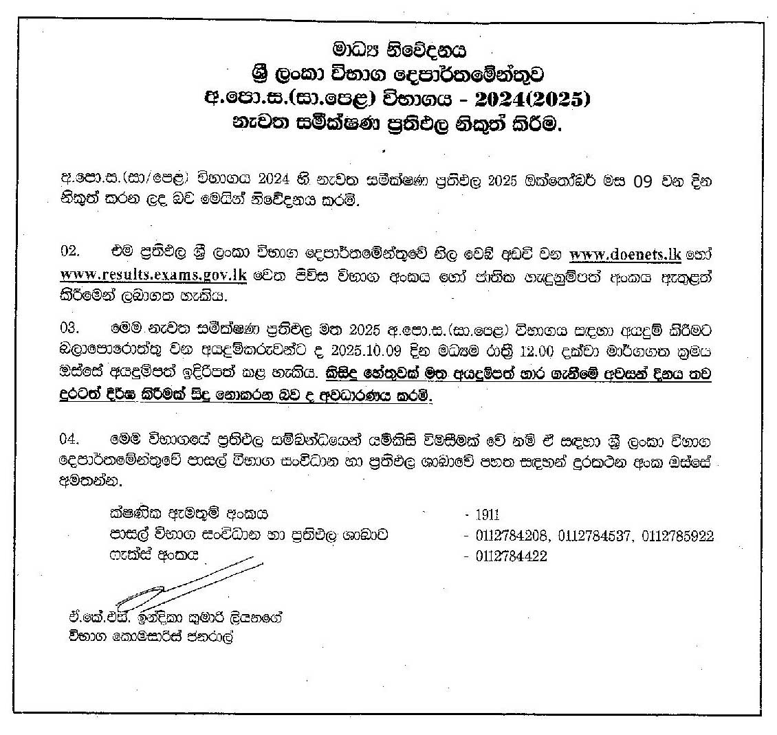 Results (After Re-scrutiny) – G.C.E. O/L Examination 2024 (2025)