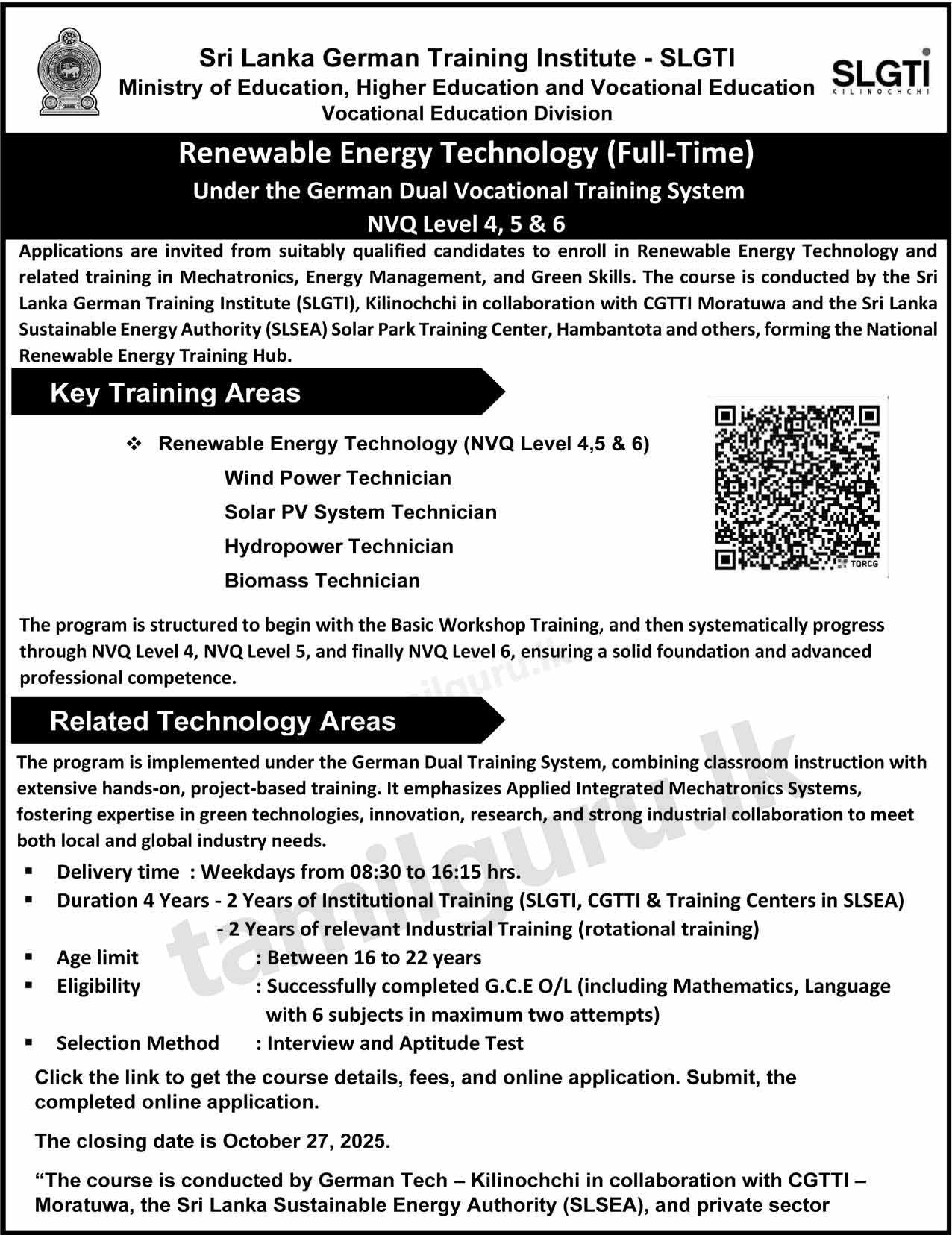 Calling Applications for Renewable Energy Technology Courses (2025 Intake) Conducted by the Sri Lanka German Training Institute (SLGTI) Kilinochchi