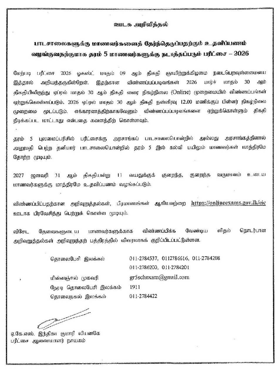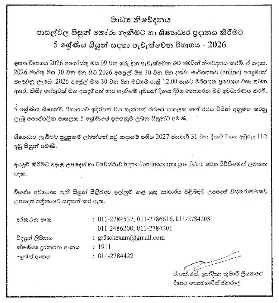 The Department of Examinations has officially announced the calling of applications for the Grade 05 Scholarship Examination – 2026.