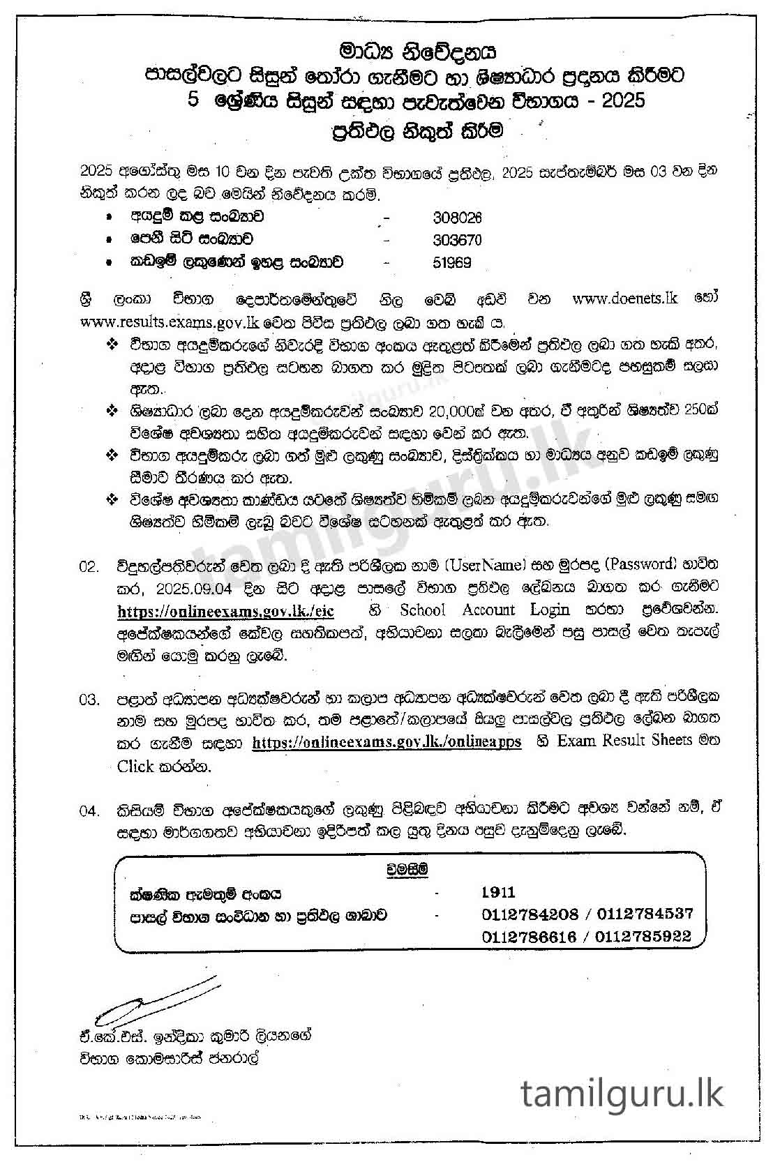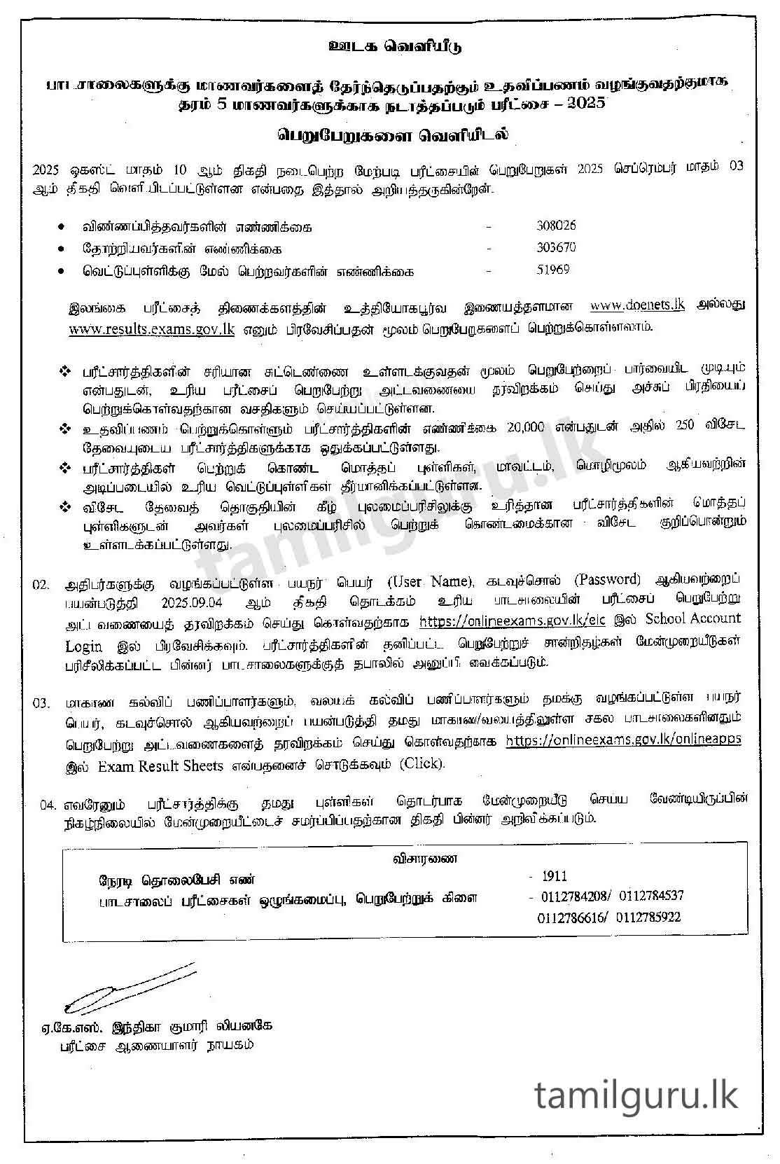 The Department of Examinations has released the results of the Grade 05 Scholarship Examination (2025), which was held on 10th August 2025.