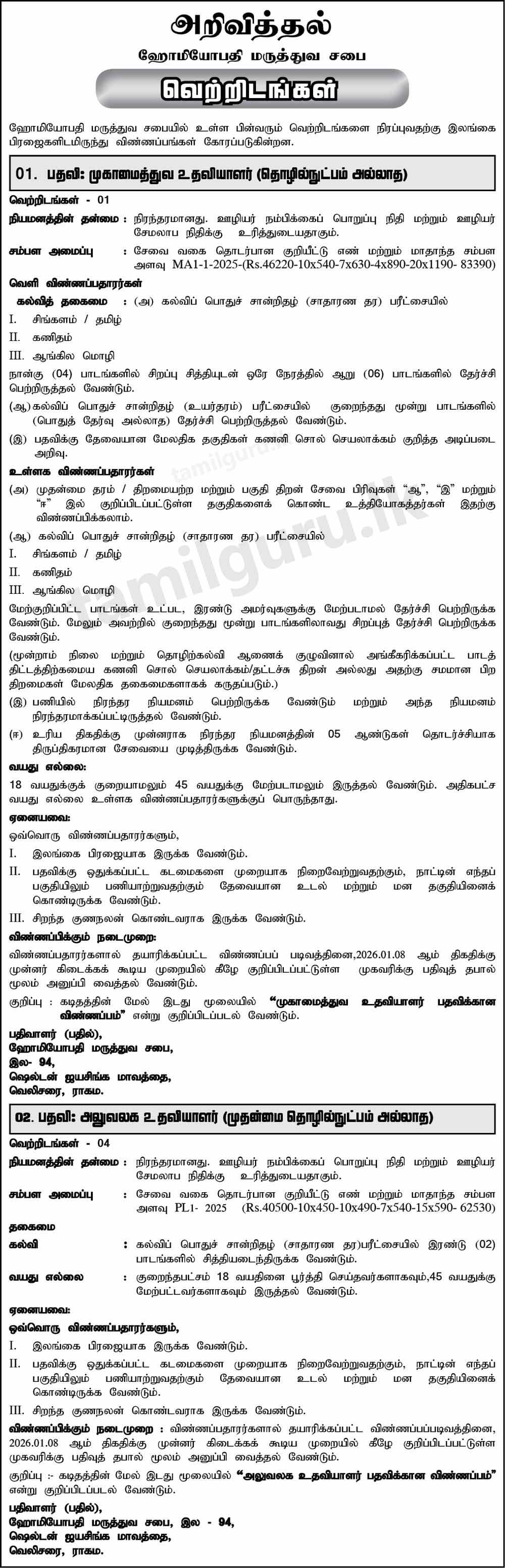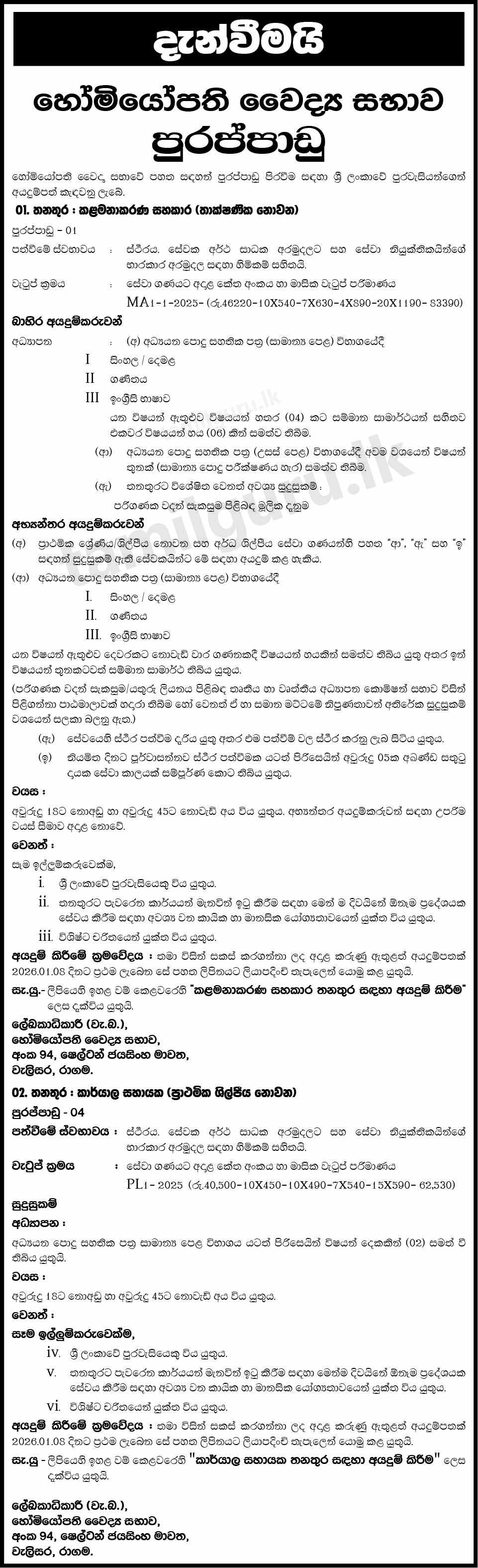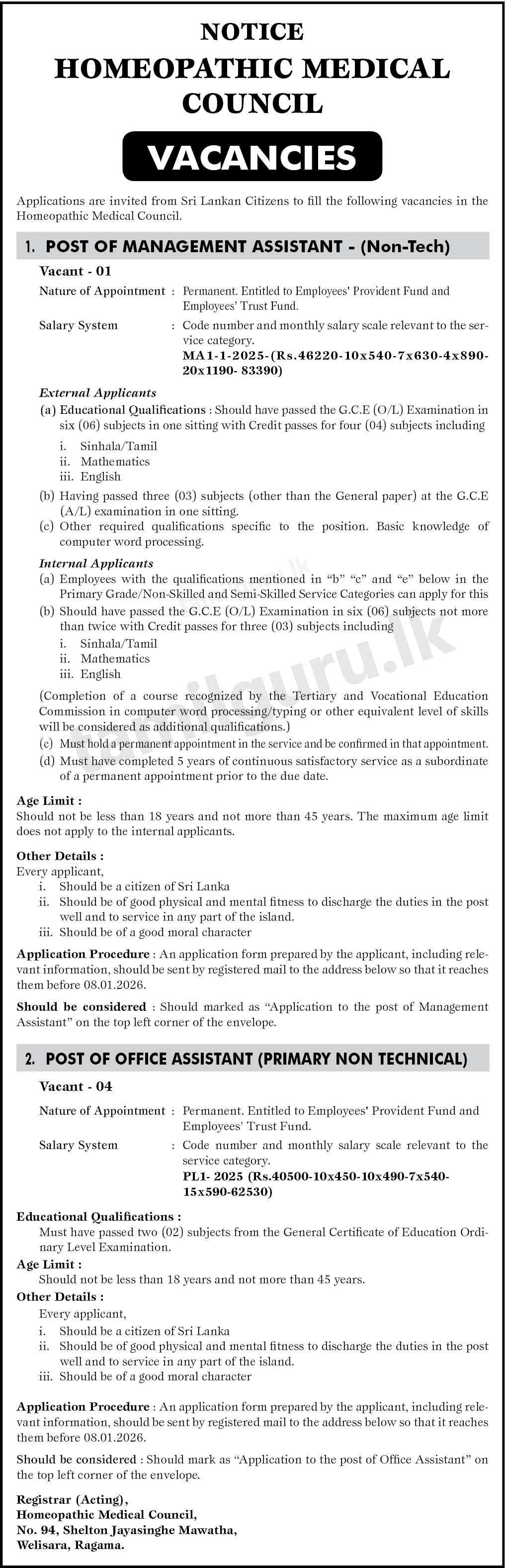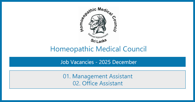 Government Jobs / Job VacanciesHomeopathic Medical Council Vacancies 2025 – Management Assistant, Office Assistant December 10, 2025December 10, 2025 - by TamilGuru.lk Advertisement Continue Reading Below Job Vacancies at Homeopathic Medical Council – 2025 December Management Assistant Office Assistant Paper Notice (AD)English | Sinhala | TamilClosing Date2026.01.08 Advertisement