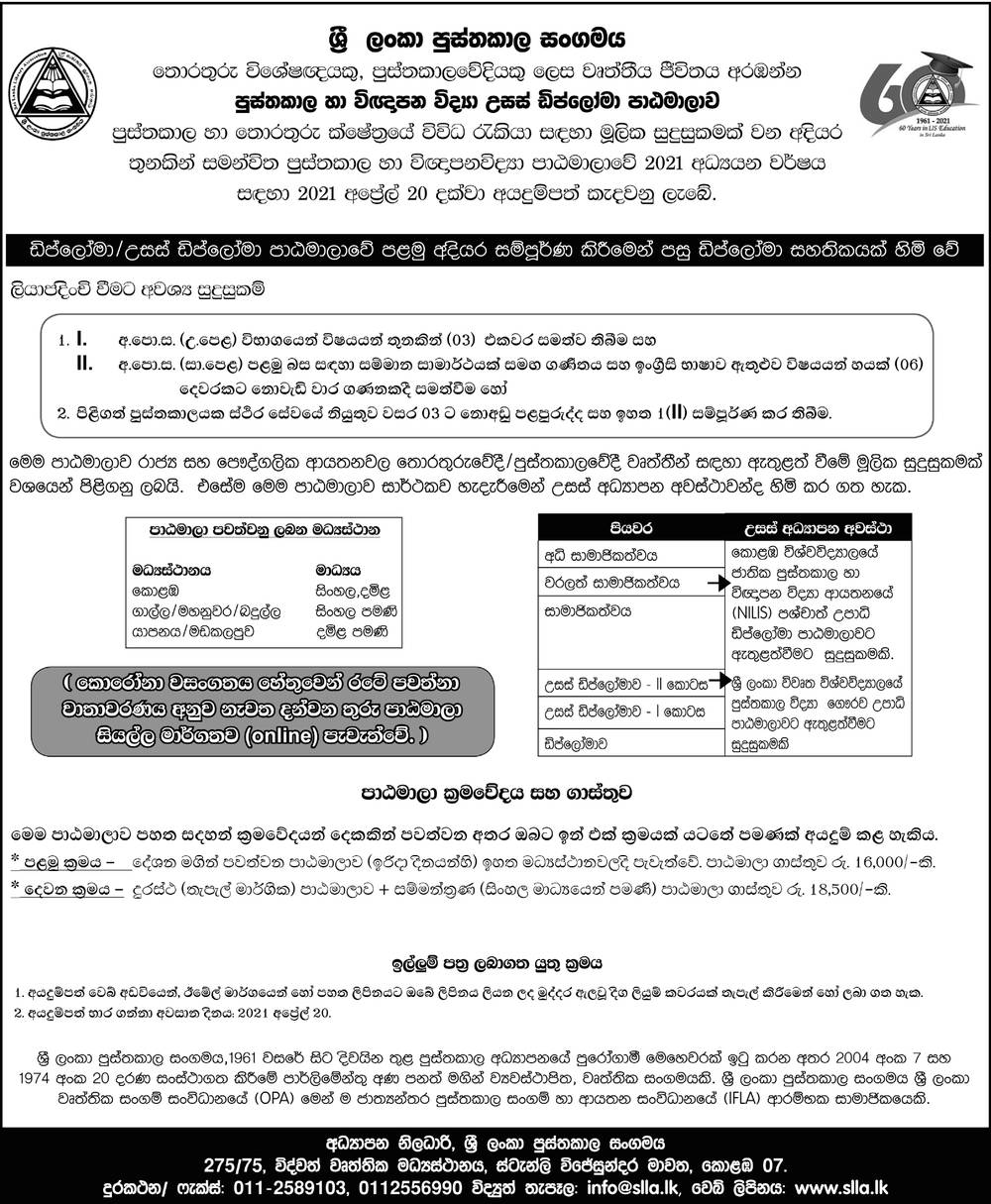 Calling Applications for Diploma / Higher Diploma in Library and Information Science (DILS / HDIPLIS) 2021