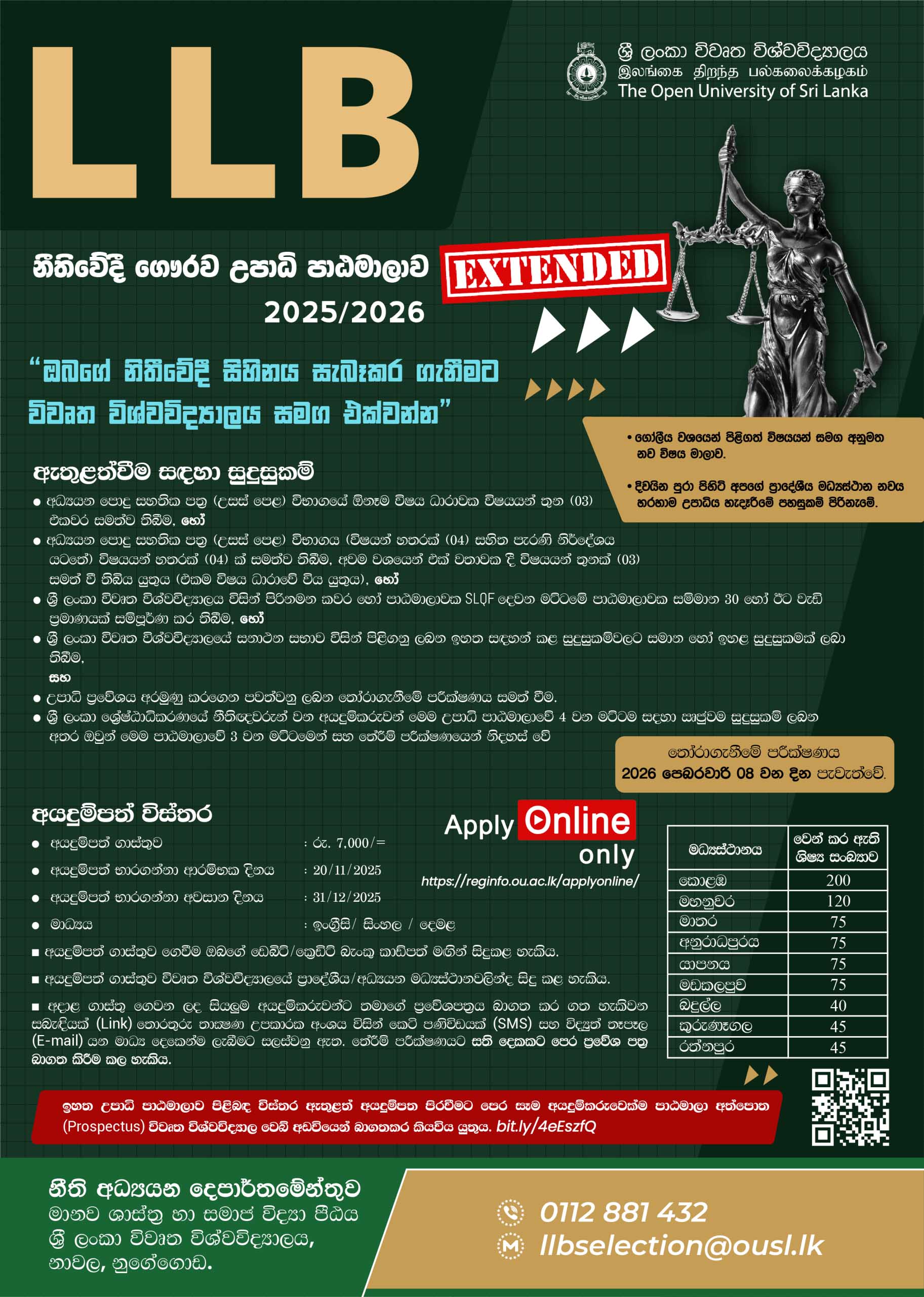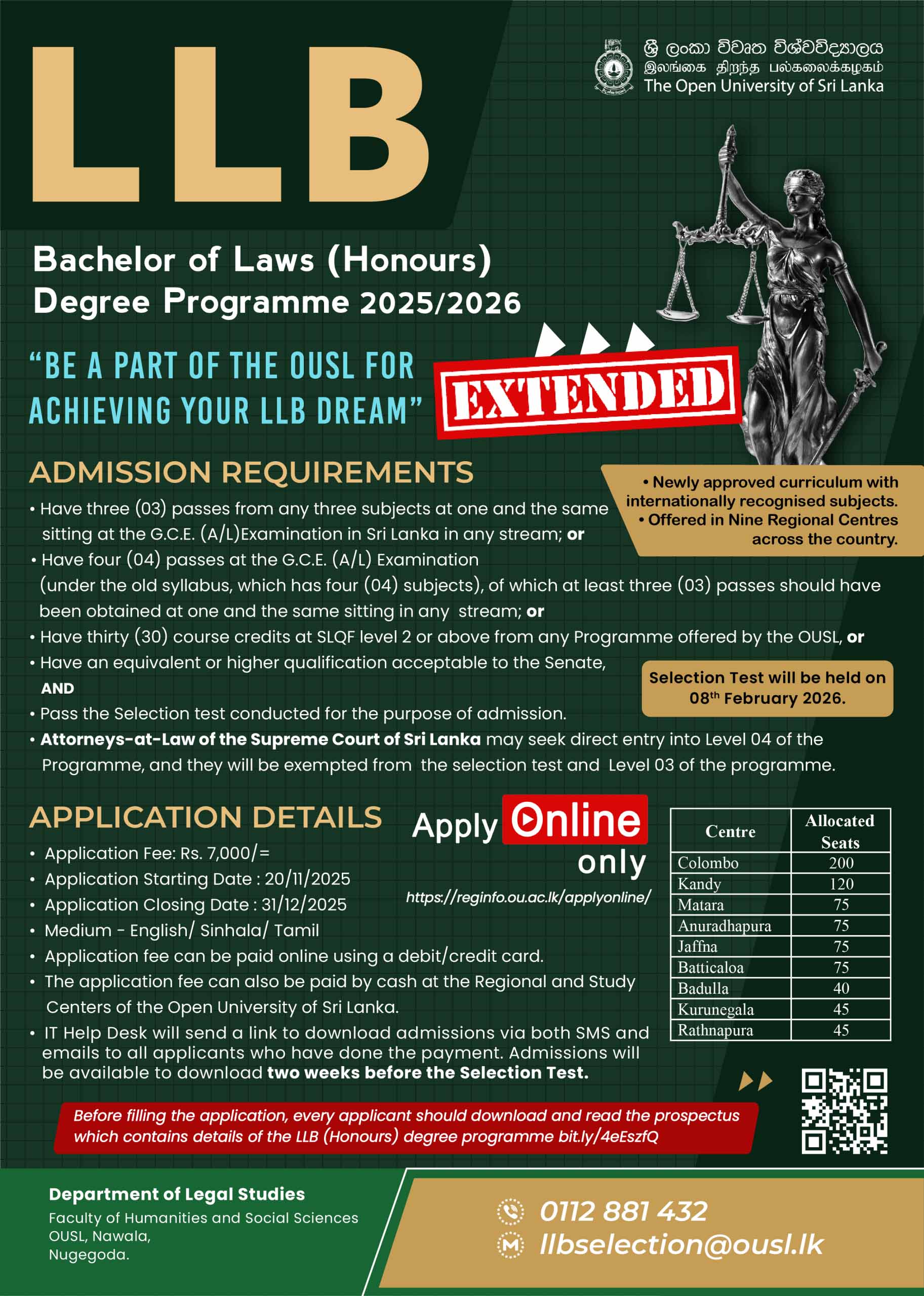 Calling Applications for Bachelor of Laws (LLB) Degree Programme (Entrance Examination) – 2025/2026 Conducted by The Open University of Sri Lanka (OUSL)