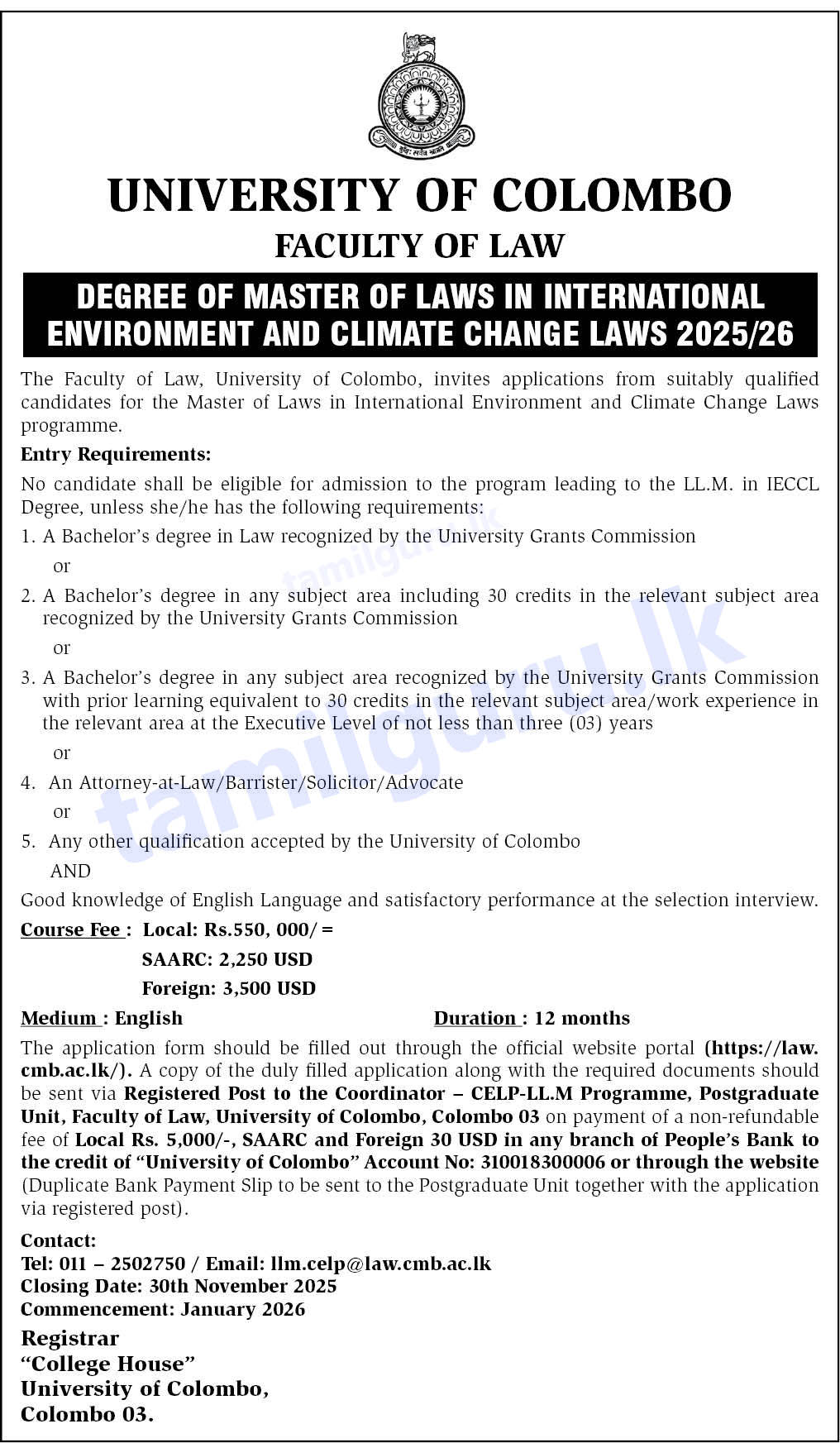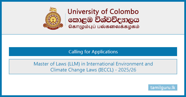 Calling Applications for Master of Laws (LLM) in International Environment and Climate Change Laws (IECCL) (2025/2026 Intake) Conducted by the Faculty of Law, University of Colombo