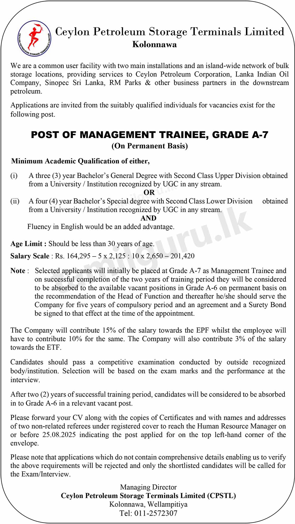 Calling Applications for Recruitment to the Post of Management Trainee at Ceylon Petroleum Storage Terminals Limited (CPSTL) – 2025 August