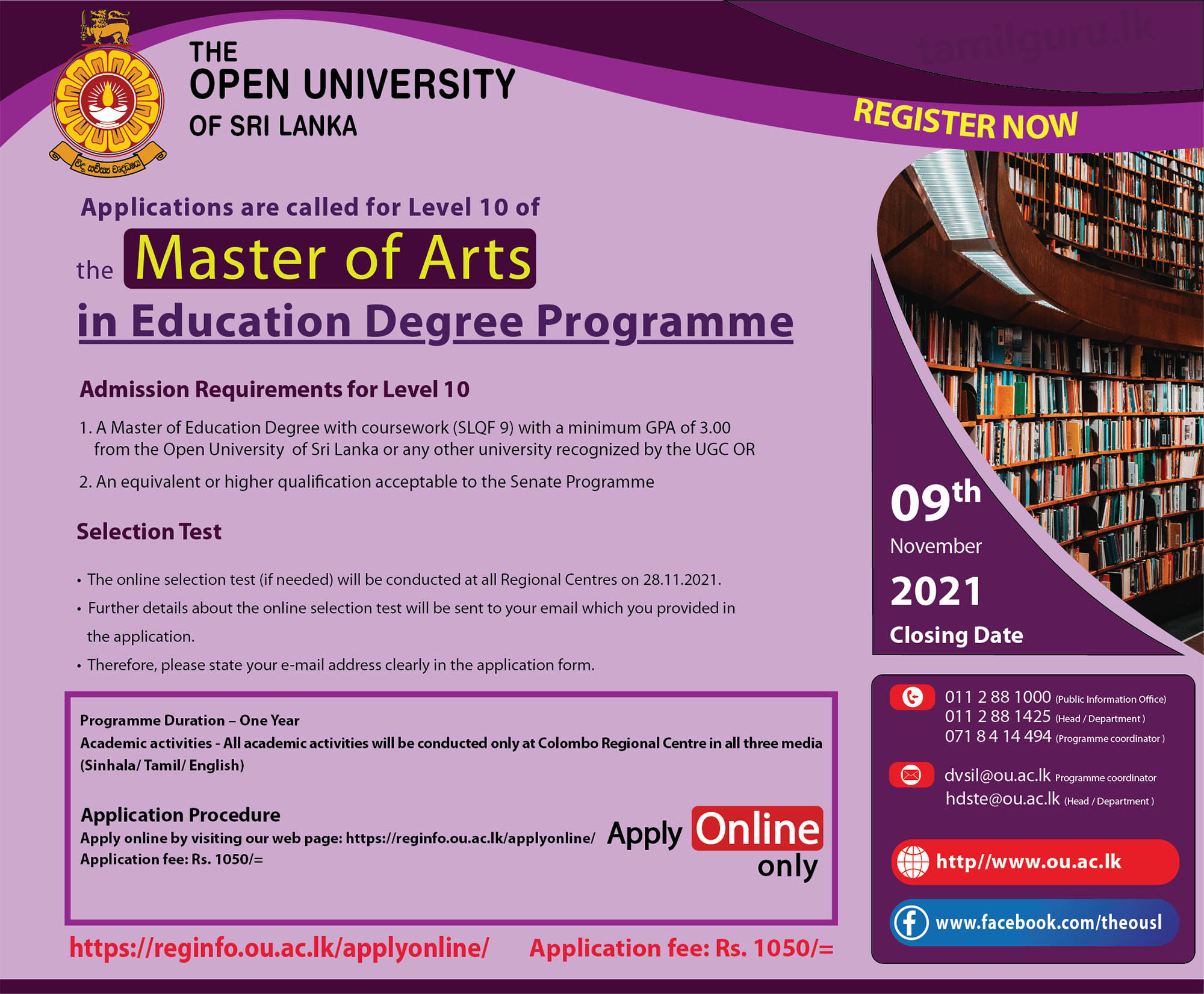 Master of Arts (MA) in Education 2021 - The Open University of Sri Lanka