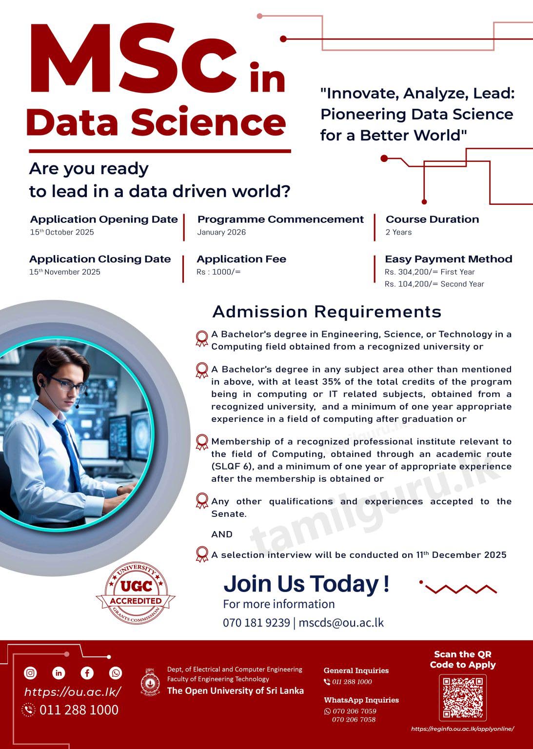 Calling Applications for Master of Science (MSc) in Data Science (Intake 2025/2026) Conducted by The Open University of Sri Lanka (OUSL)