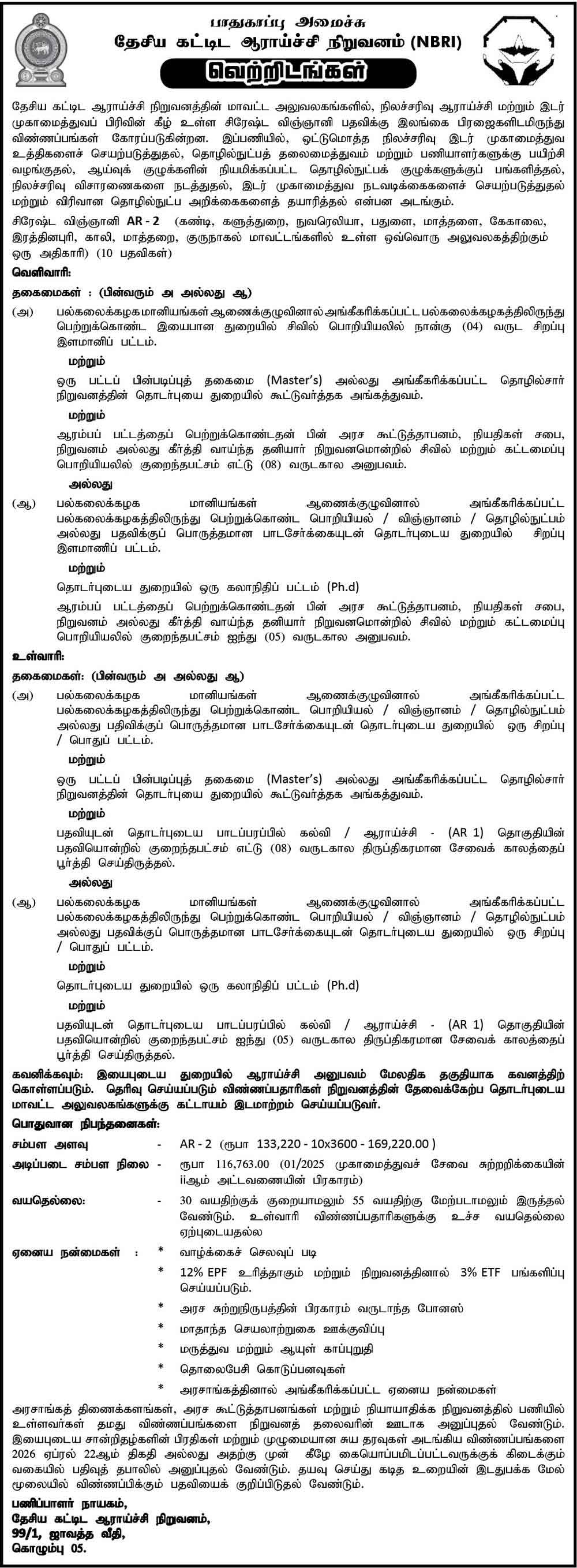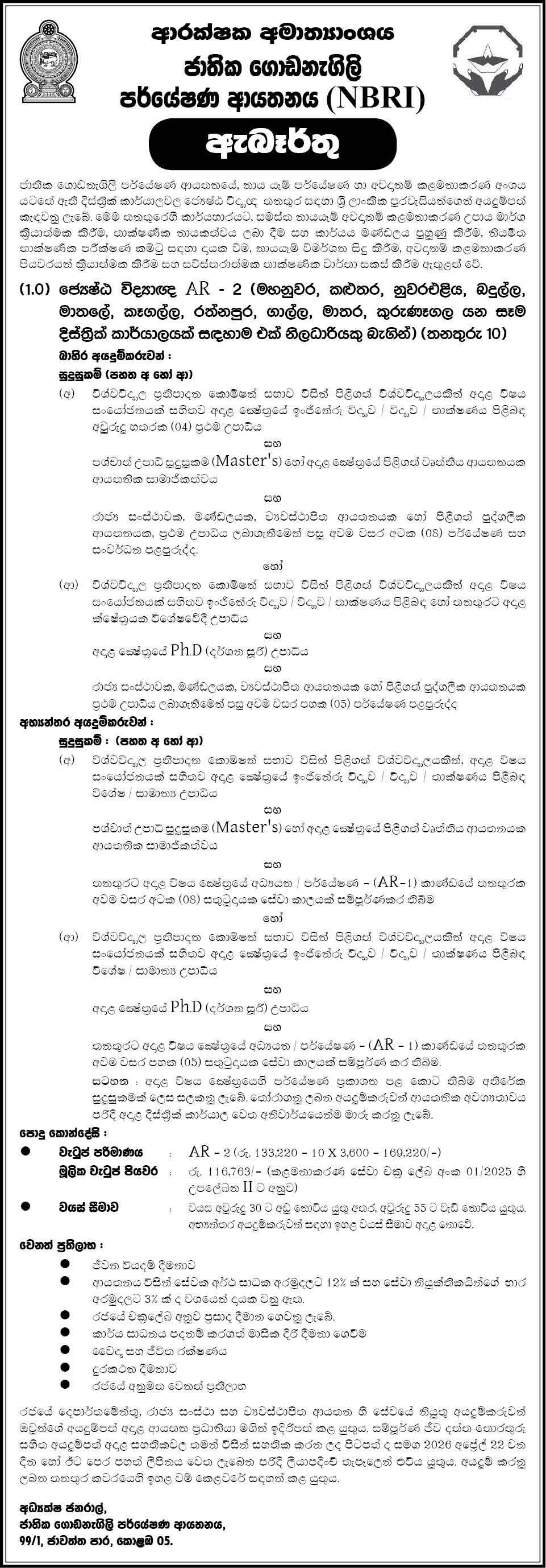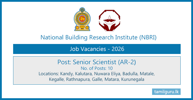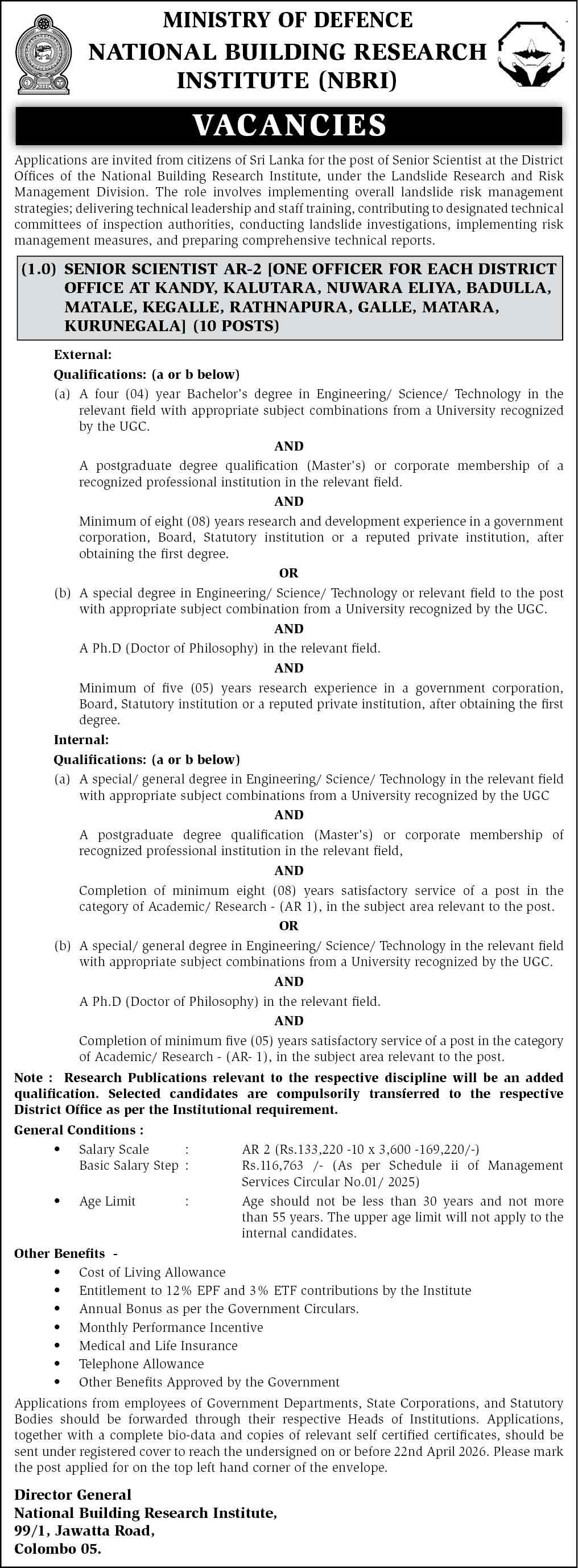 Applications are invited for Senior Scientist (AR-2) posts at the National Building Research Institute, functioning under the Ministry of Defence.
