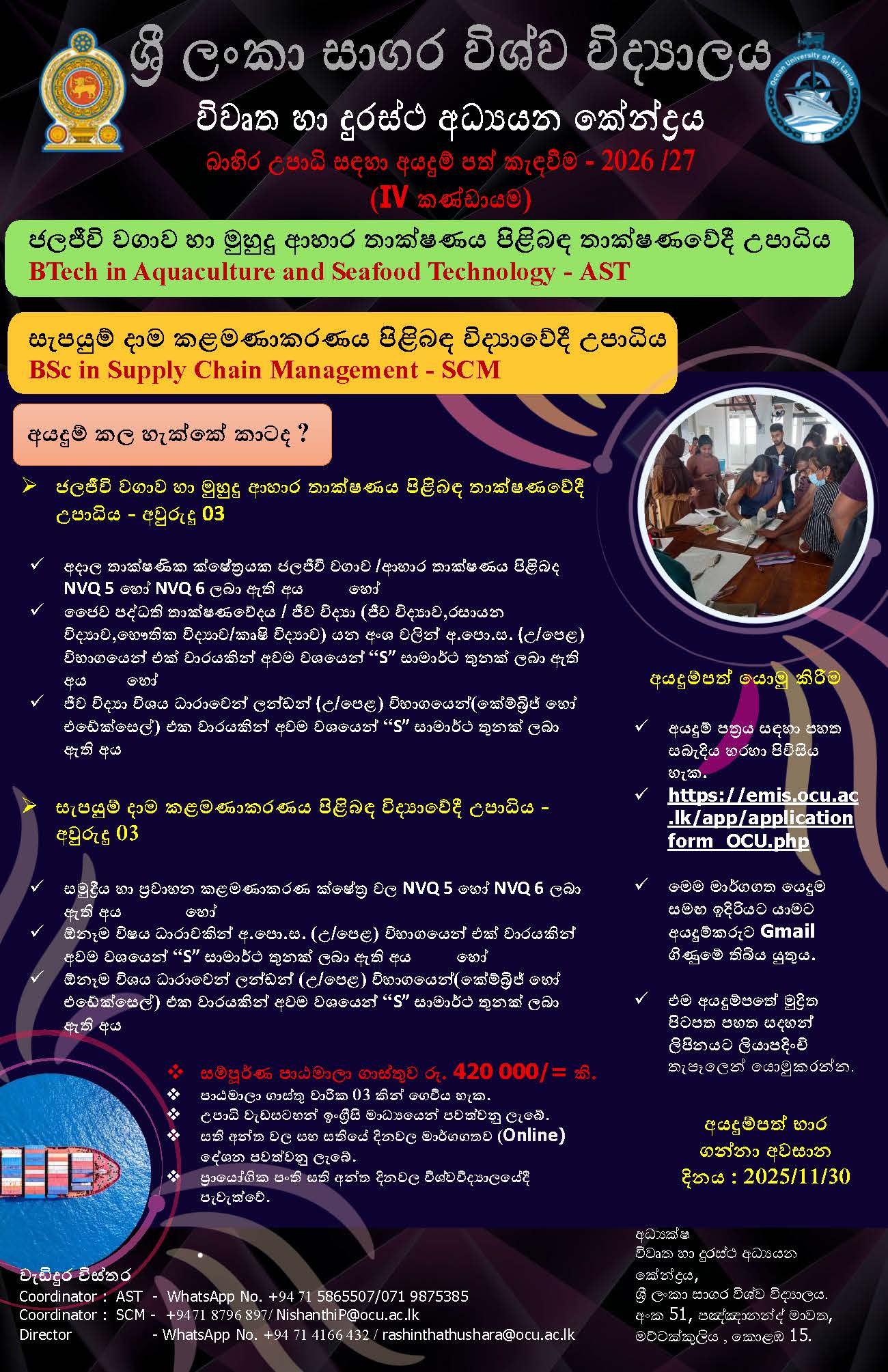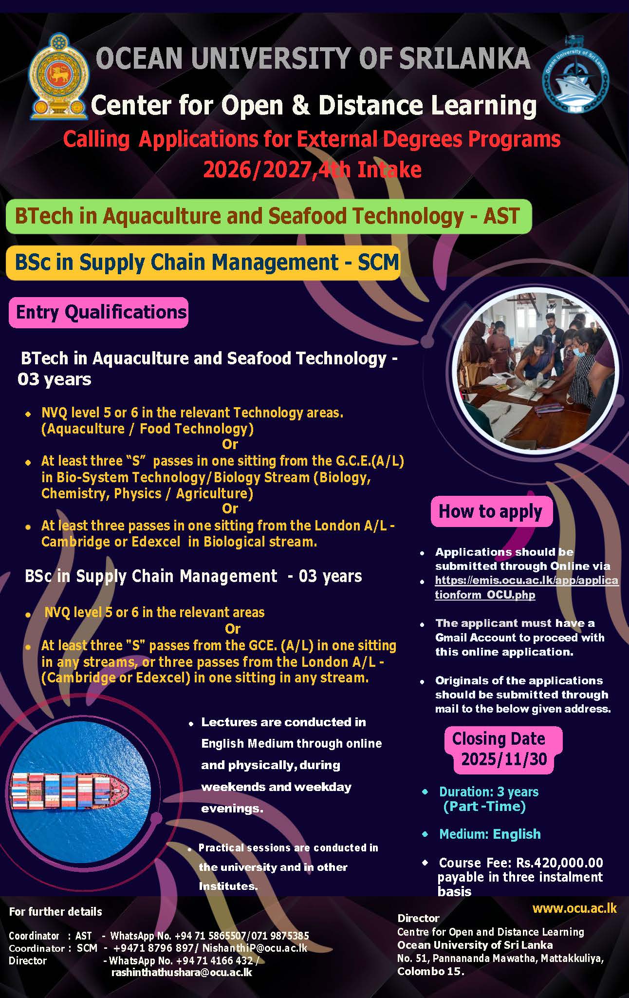 Calling Applications for External Degree Programs 2026/2027 Conducted by the Centre for Open and Distance Learning (CODL), Ocean University of Sri Lanka (OCUSL)