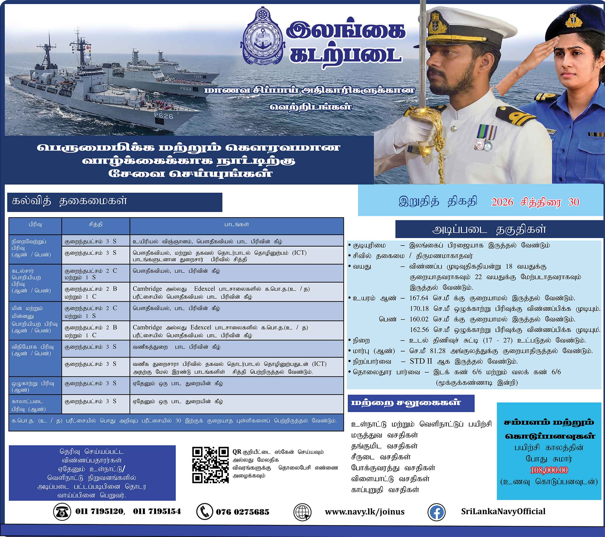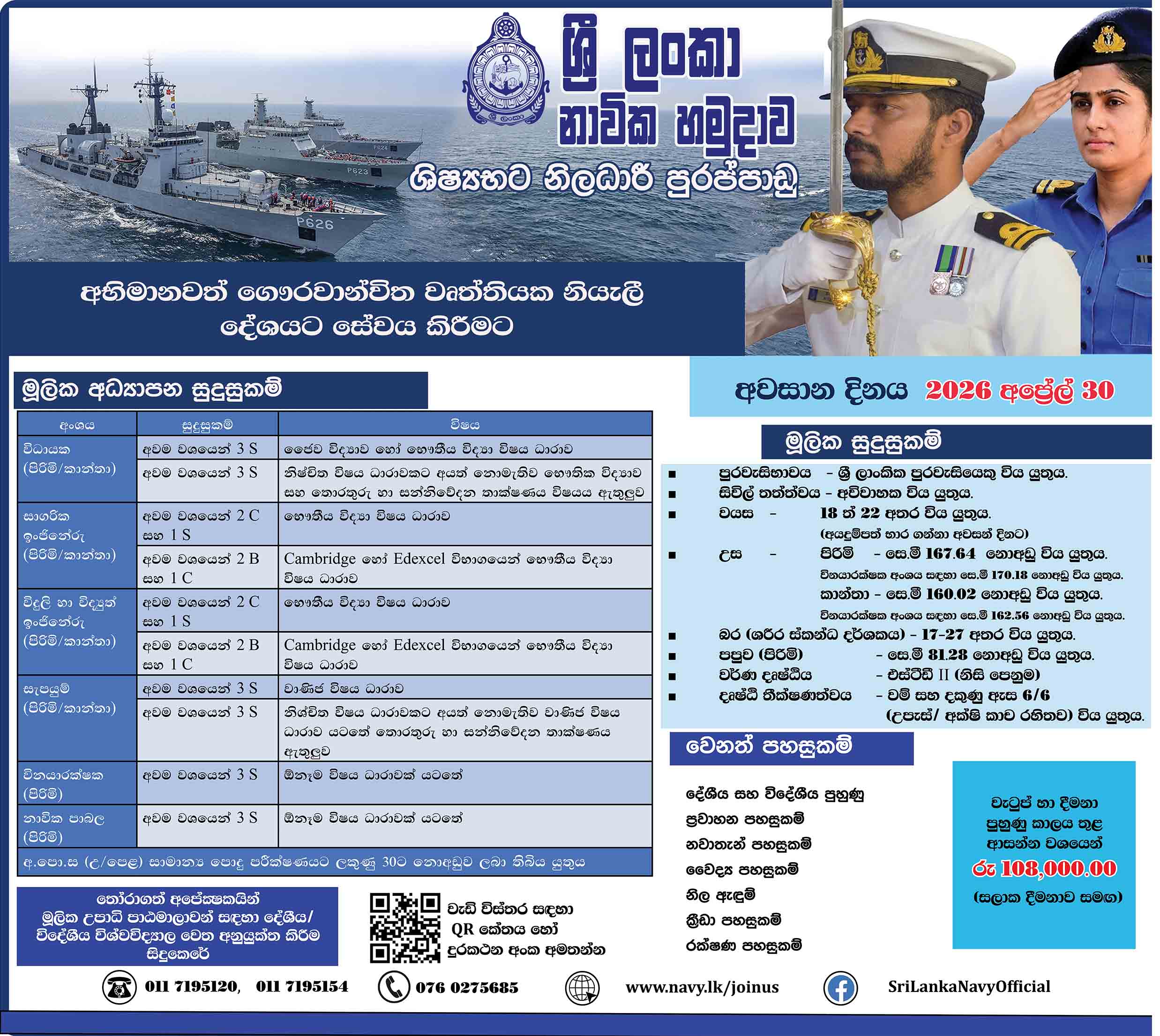 The Sri Lanka Navy has officially announced Officer Cadet Vacancies for 2026 in the Regular Naval Force.