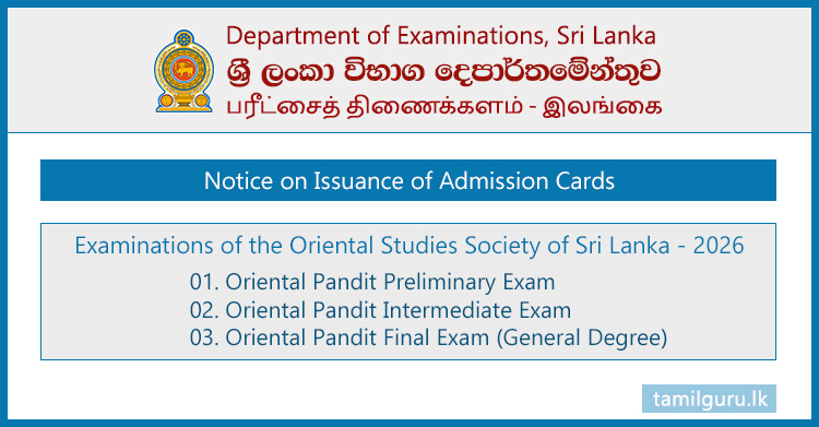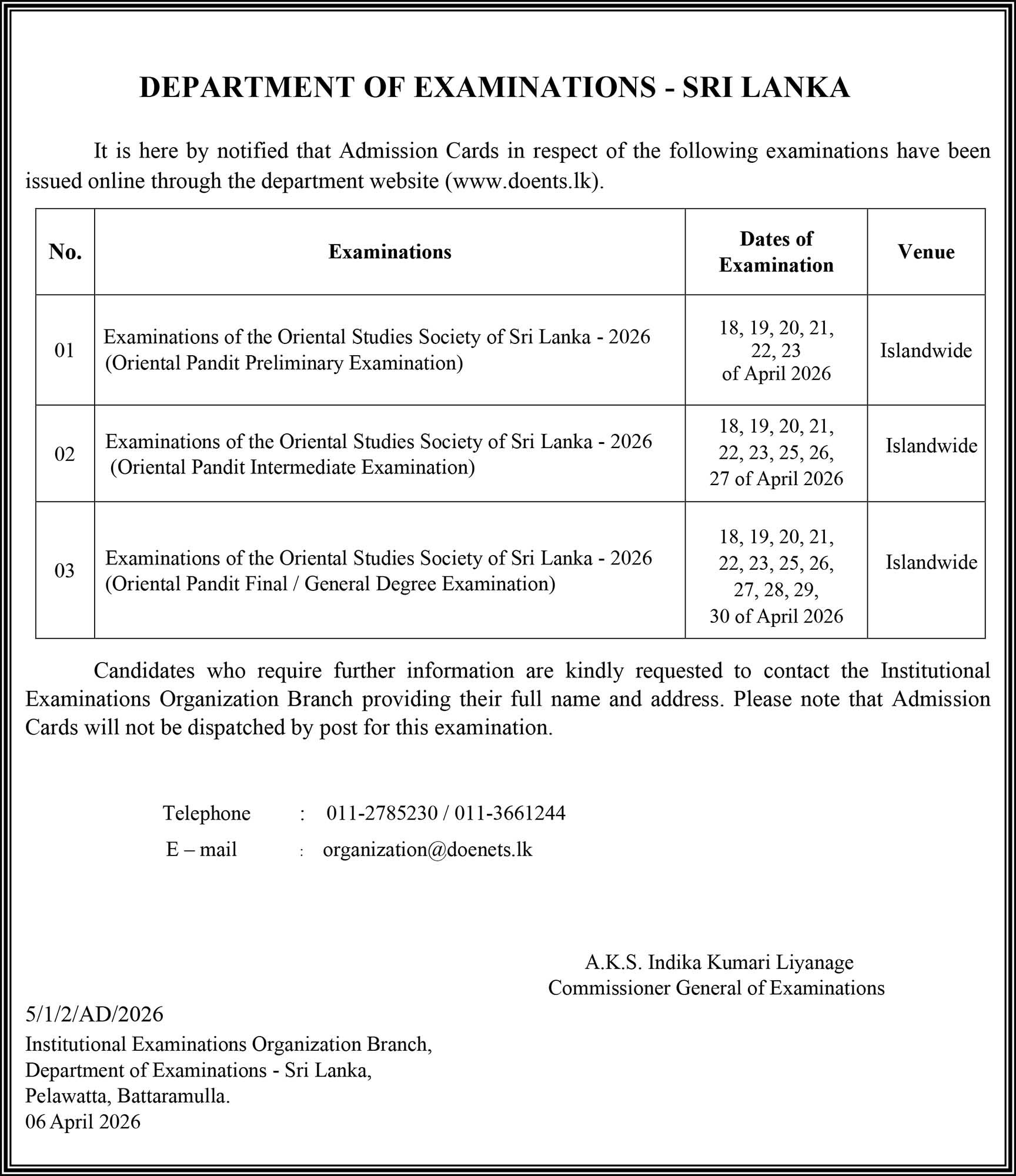 The Department of Examinations has announced that the Admission Cards for the Examinations of the Oriental Studies Society of Sri Lanka – 2026 are now available online.