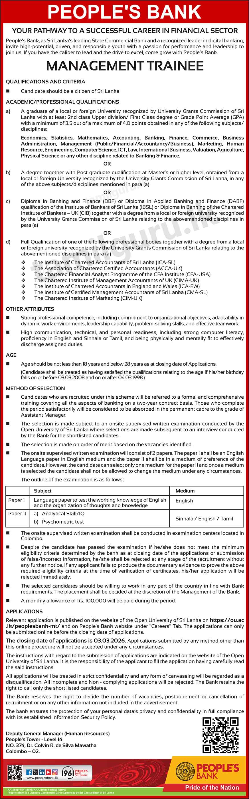 Calling Applications for Recruitment to the Post of Management Trainee at People’s Bank – 2026