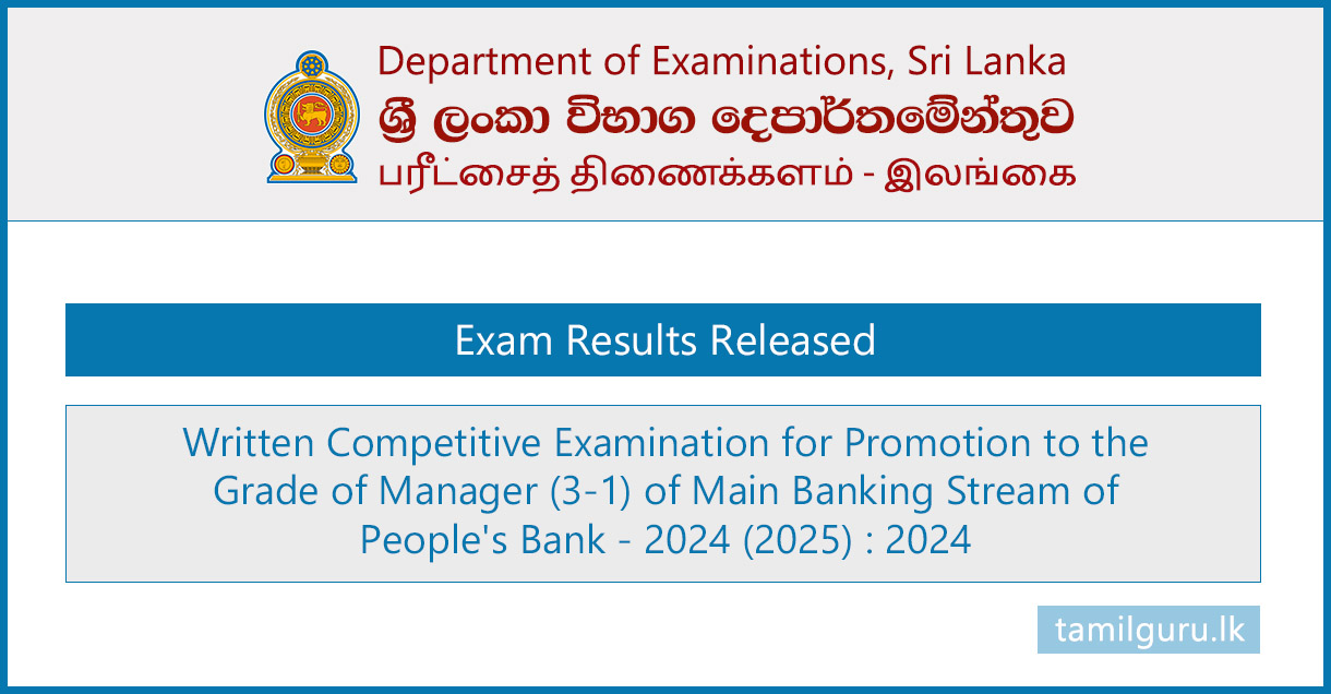 The Department of Examinations has released the results of the Written Competitive Examination for Promotion to the Grade of Manager (3 – 1) of the Main Banking Stream of People’s Bank – 2024 (2025).