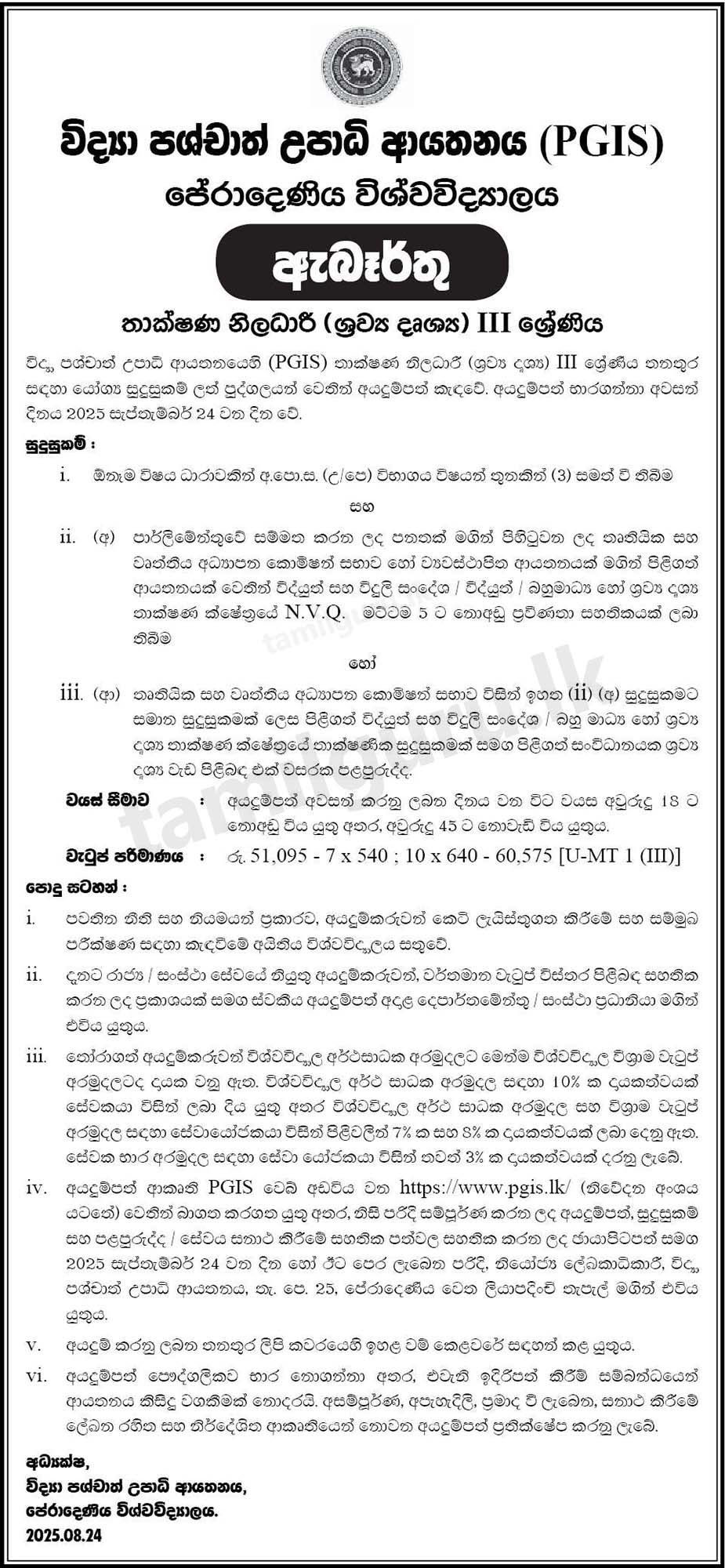 Job Vacancies at Postgraduate Institute of Science (PGIS), University of Peradeniya – 2025 August / September