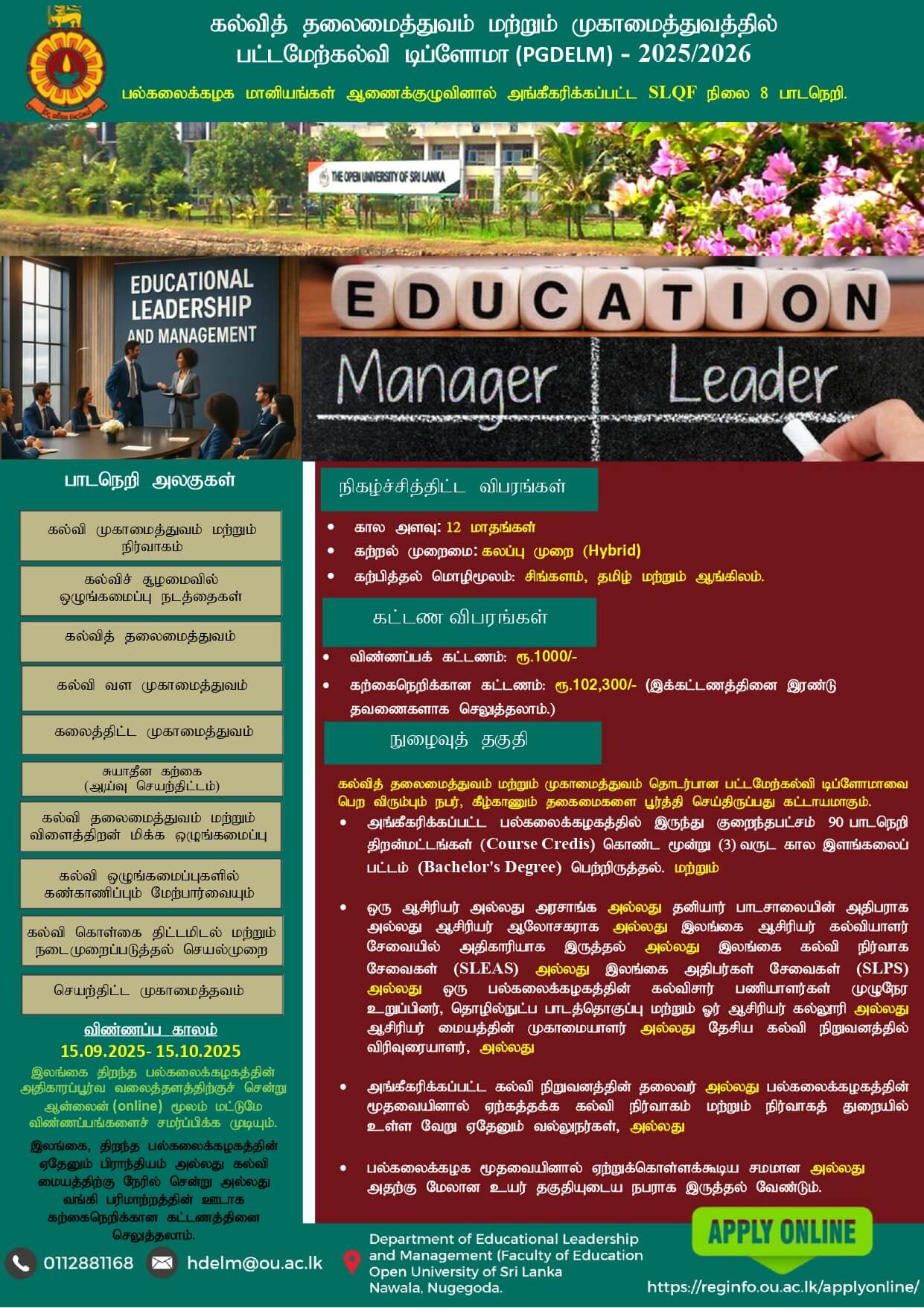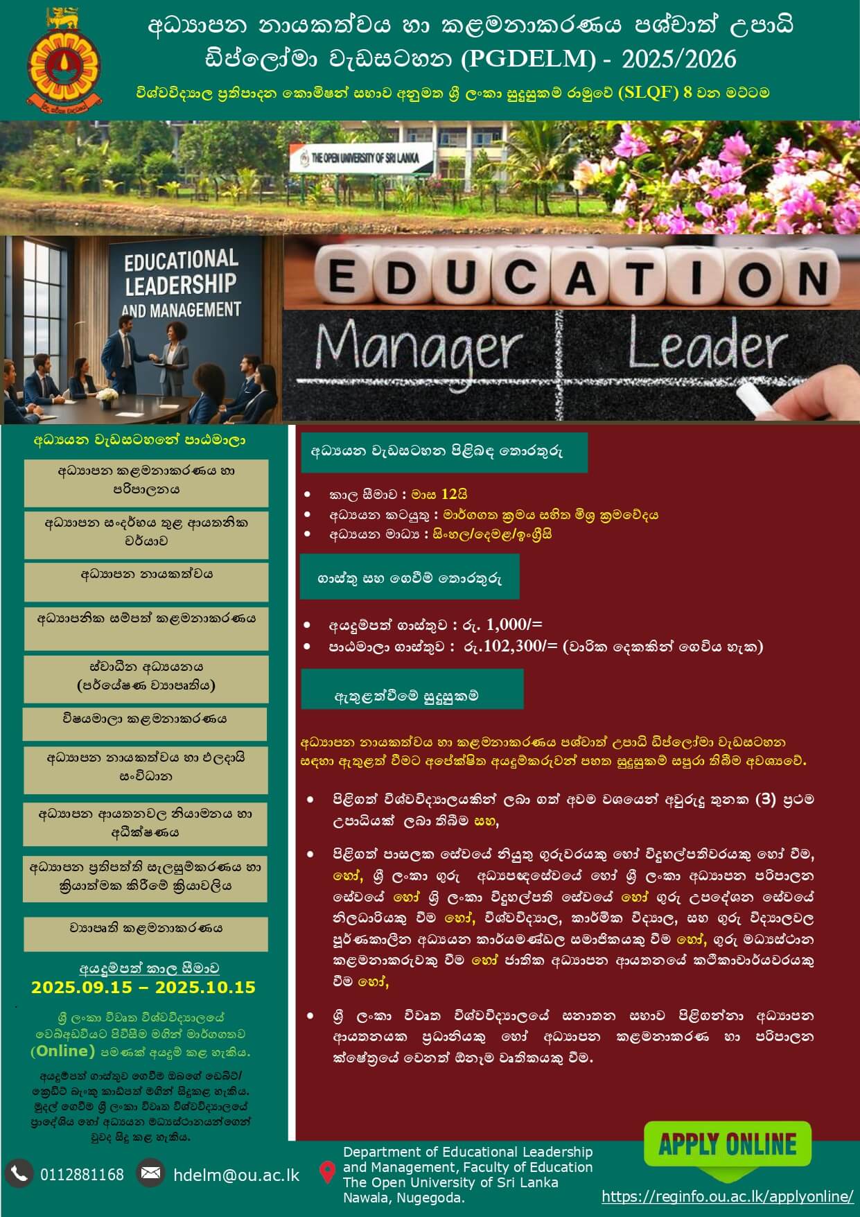 Calling Applications for Postgraduate Diploma in Educational Leadership and Management (PGDELM) 2025/2026 Conducted by The Open University of Sri Lanka (OUSL)