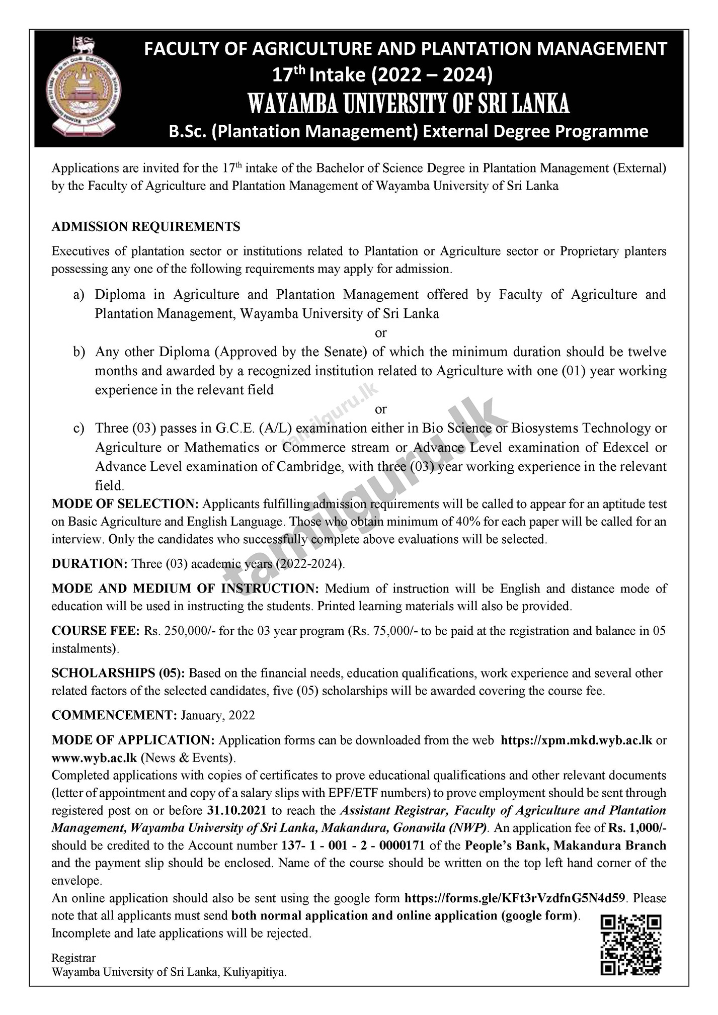 BSc (Plantation Management) External Degree 2021 - Wayamba University of Sri Lanka