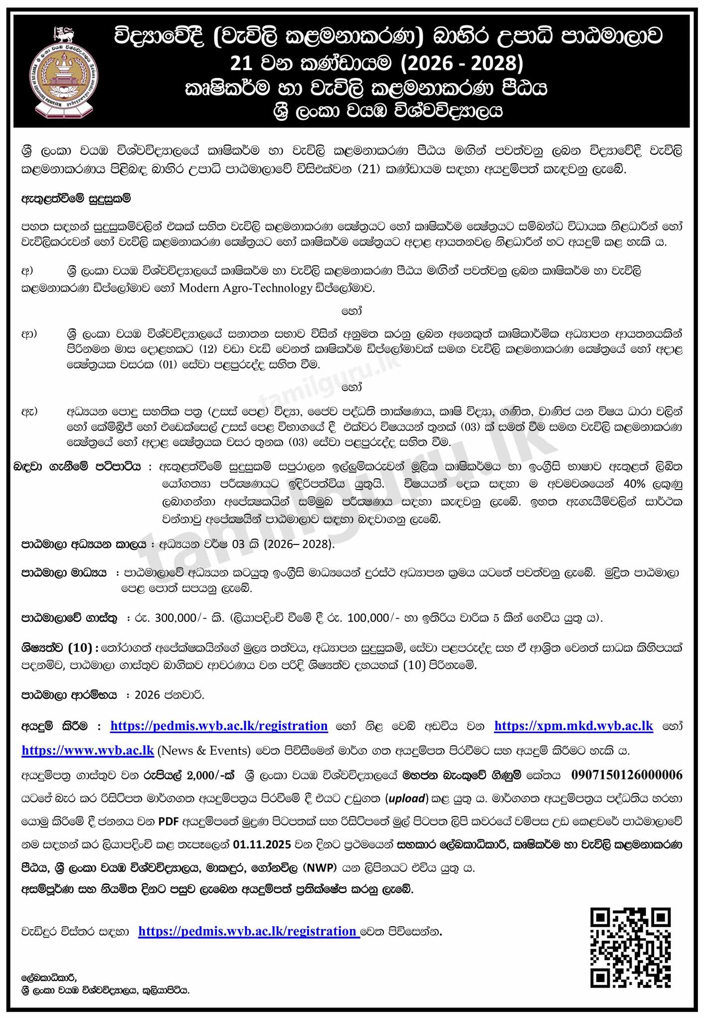 Calling Applications for B.Sc. in Plantation Management (External) Degree Programme (21st Intake 2026-2028) Conducted by the Faculty of Agriculture and Plantation Management, Wayamba University of Sri Lanka (WUSL)