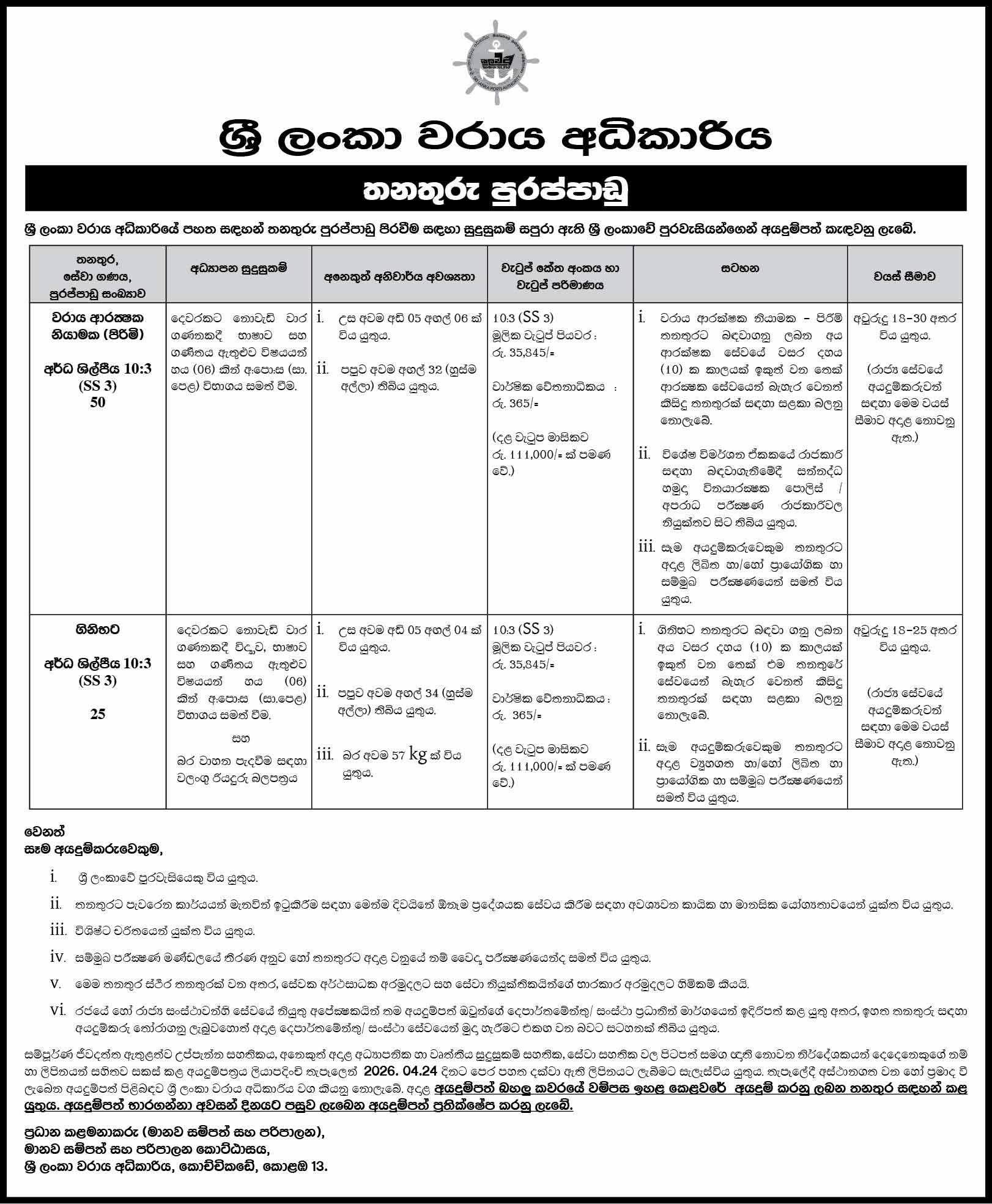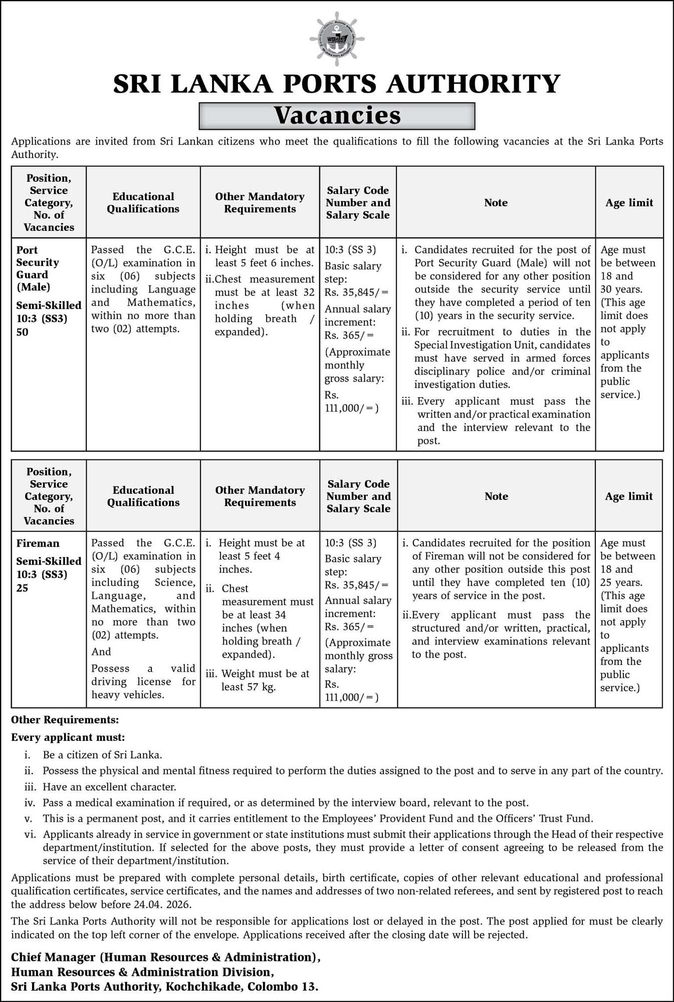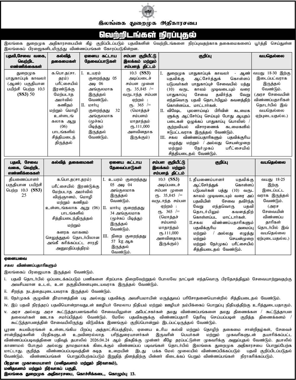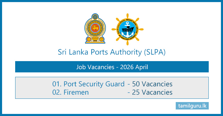 The Sri Lanka Ports Authority (SLPA) calls for applications from qualified Sri Lankan citizens to fill the following vacancies – 2026