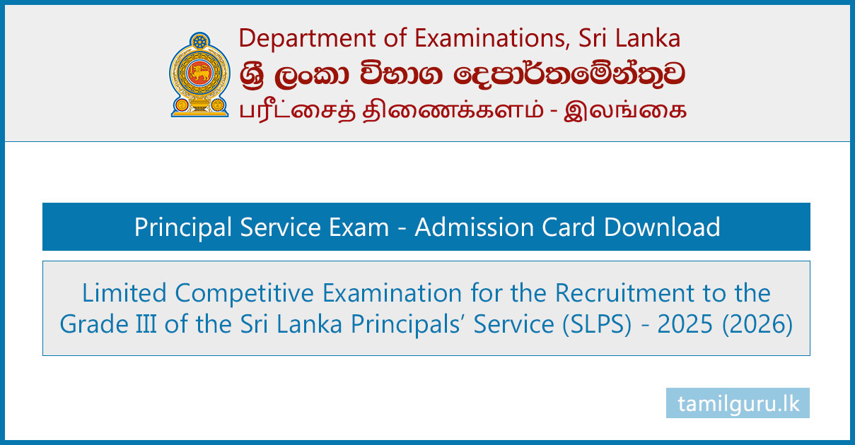 The Department of Examinations has announced that the Admission Cards for the Limited Competitive Examination for the Recruitment to the Grade III of the Sri Lanka Principals’ Service (SLPS) – 2025 (2026) have been released online.