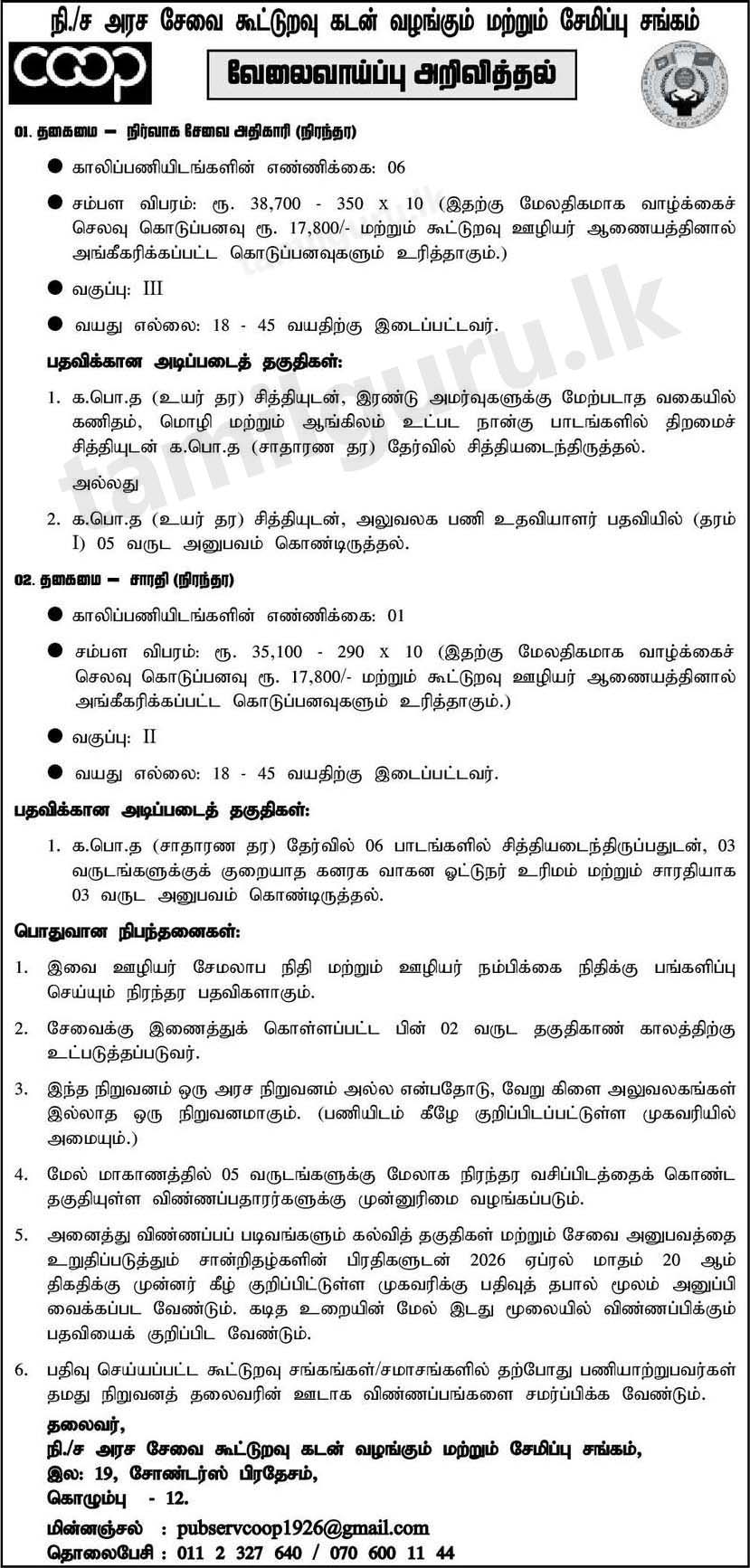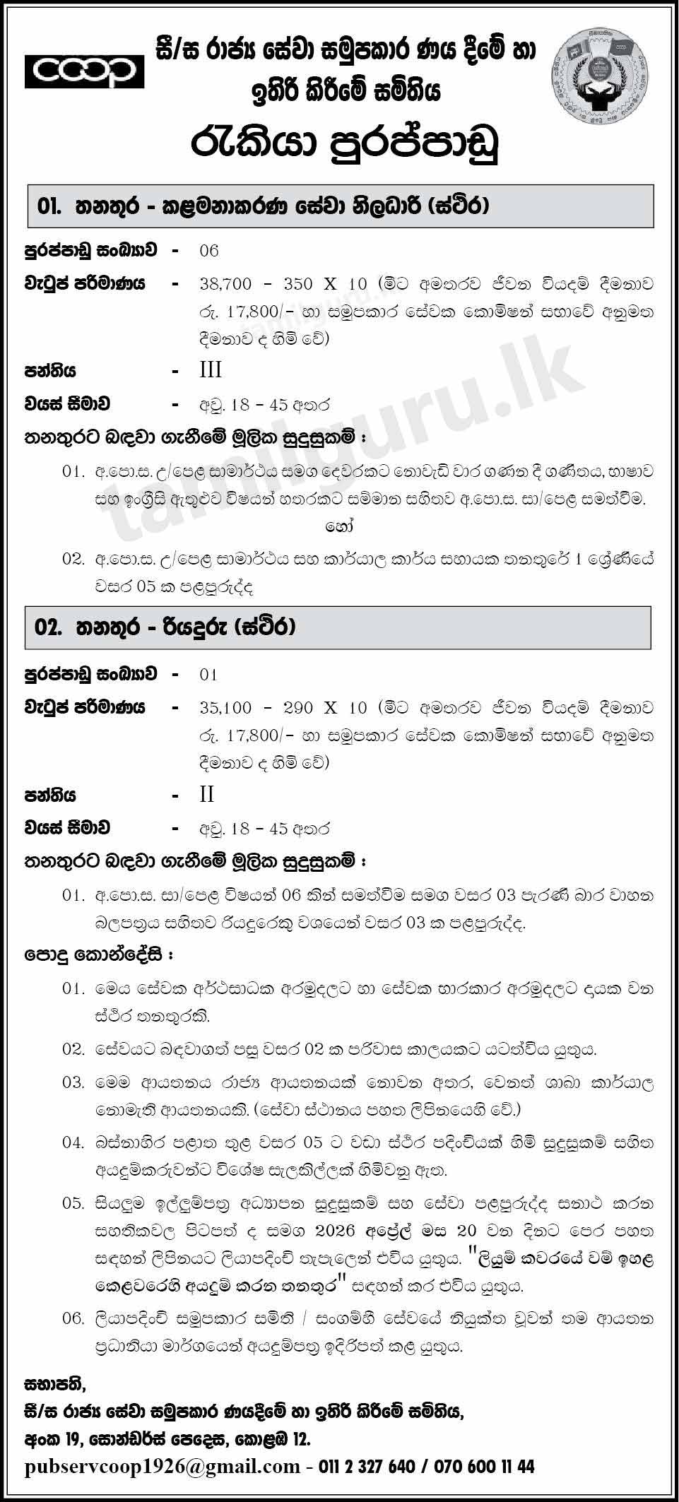 Job VacanciesPublic Service Cooperative Credit and Thrift Society Ltd Job Vacancies 2026 April March 27, 2026March 27, 2026 - by TamilGuru.lk Advertisement Continue Reading Below Job Vacancies at Public Service Cooperative Credit and Thrift Society Ltd – 2026 March / April Management Services Officer Driver Paper Notice (AD)English | Sinhala | TamilClosing Date2026.04.20 Advertisement