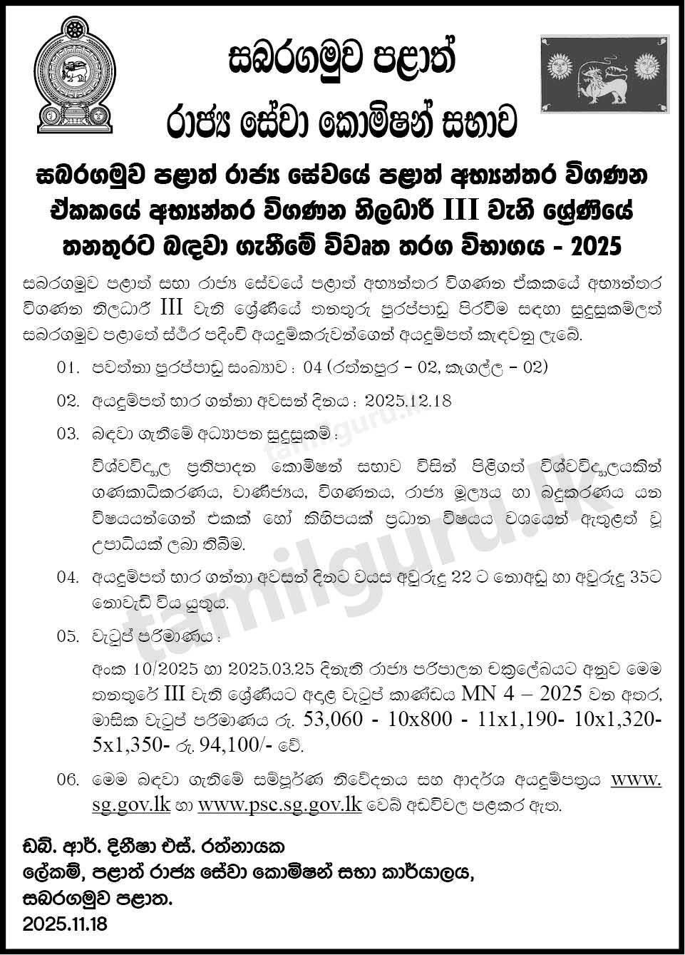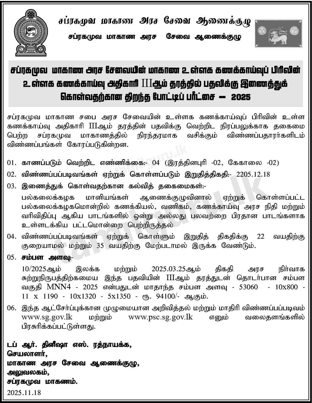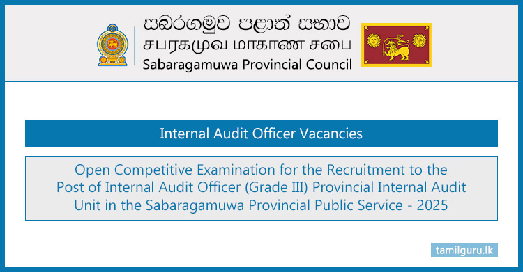 Calling for Applications – Open Competitive Examination for the Recruitment to the Post of Internal Audit Officer – Grade III Provincial Internal Audit Unit in the Sabaragamuwa Provincial Public Service – 2025