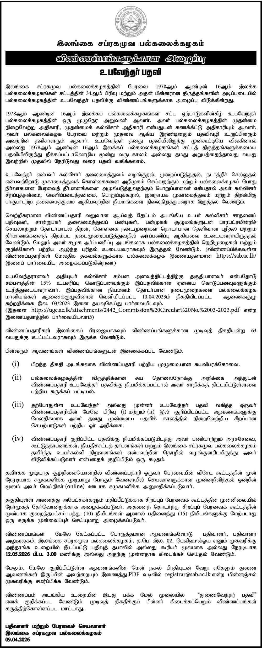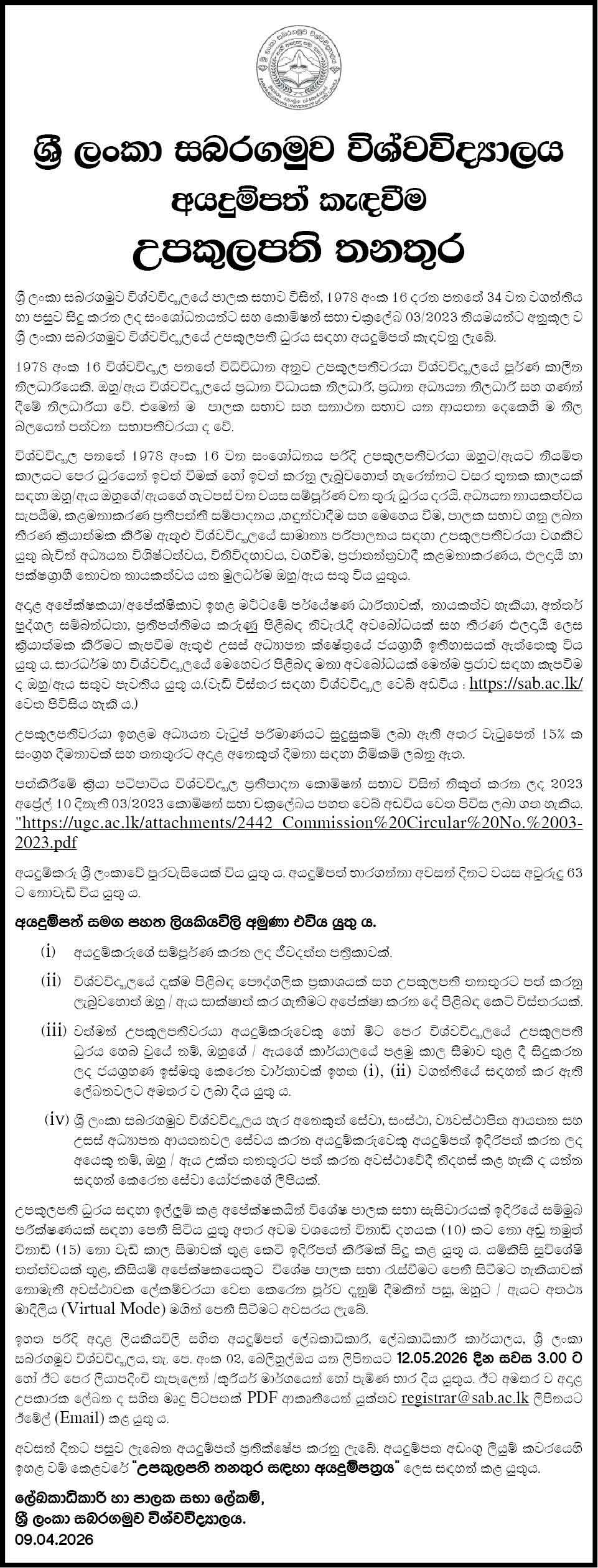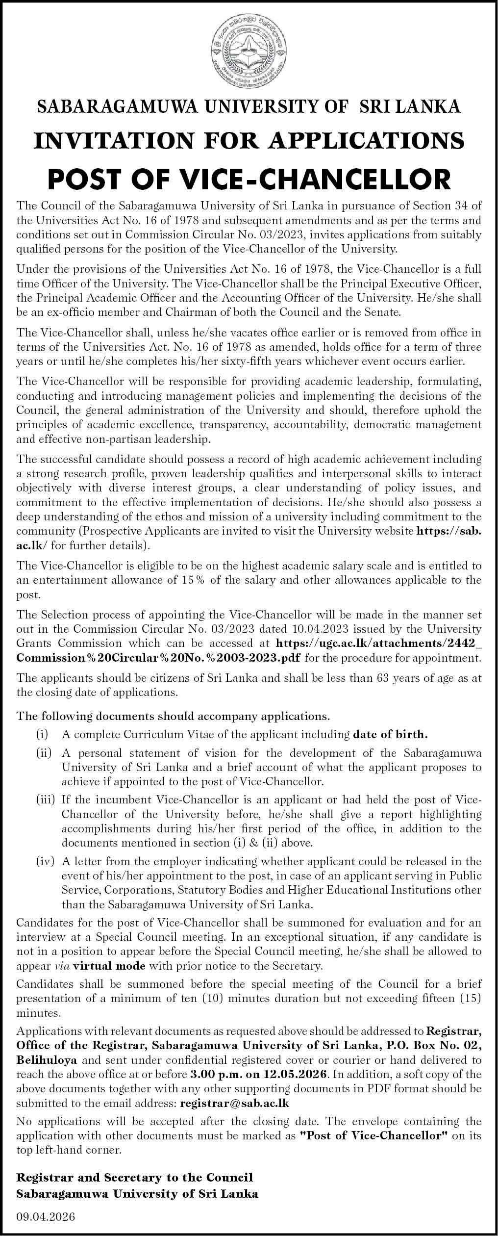 The Sabaragamuwa University of Sri Lanka has officially invited applications from suitably qualified candidates for the prestigious position of Vice-Chancellor.