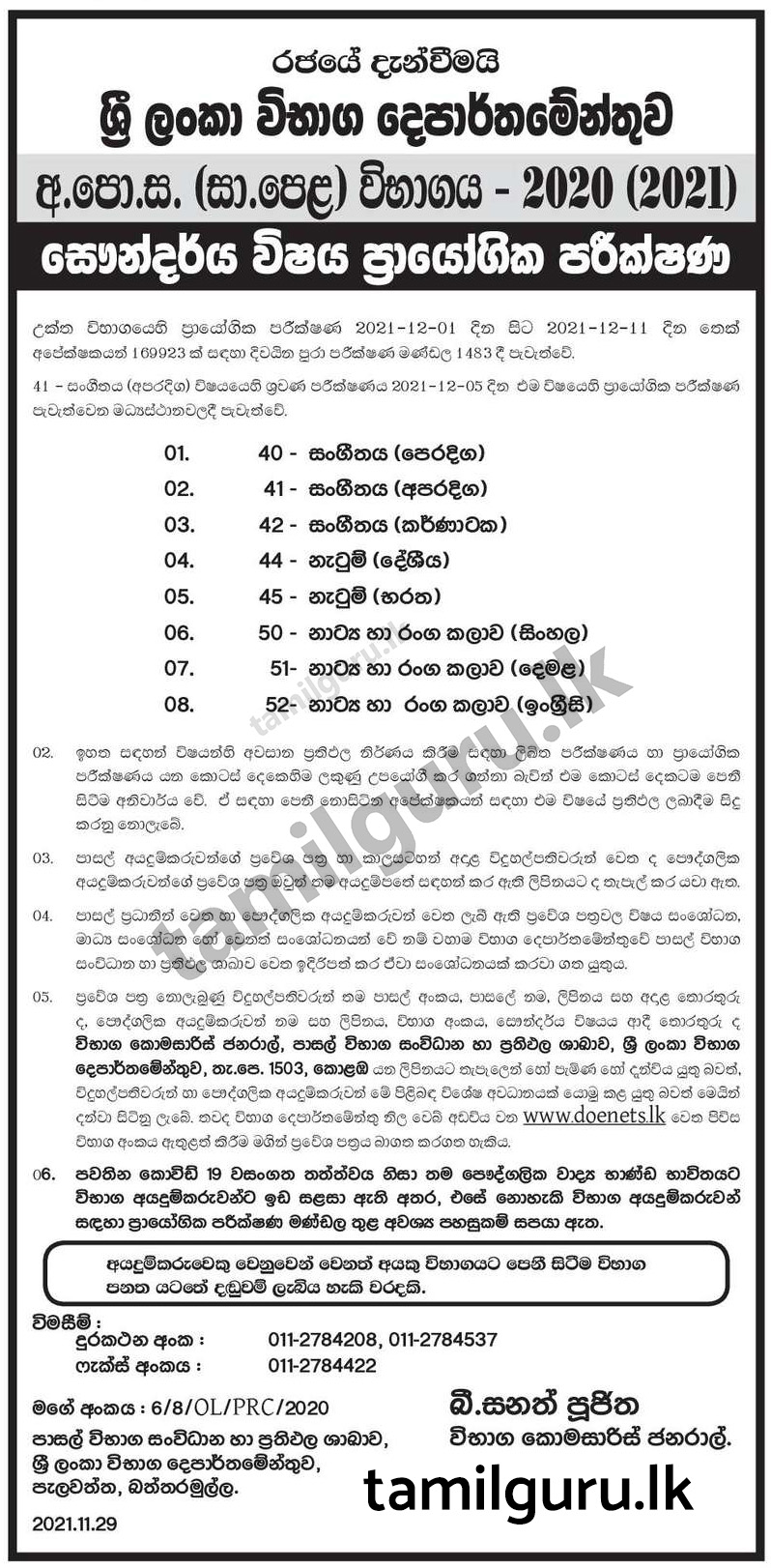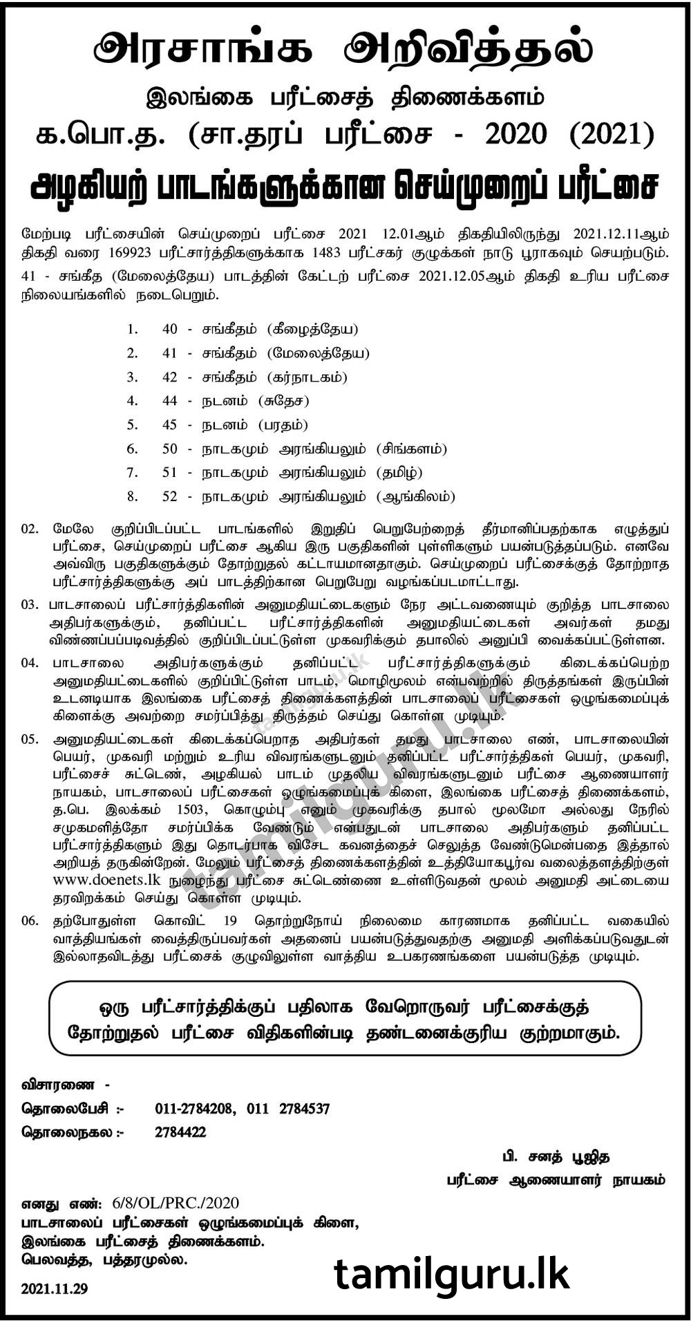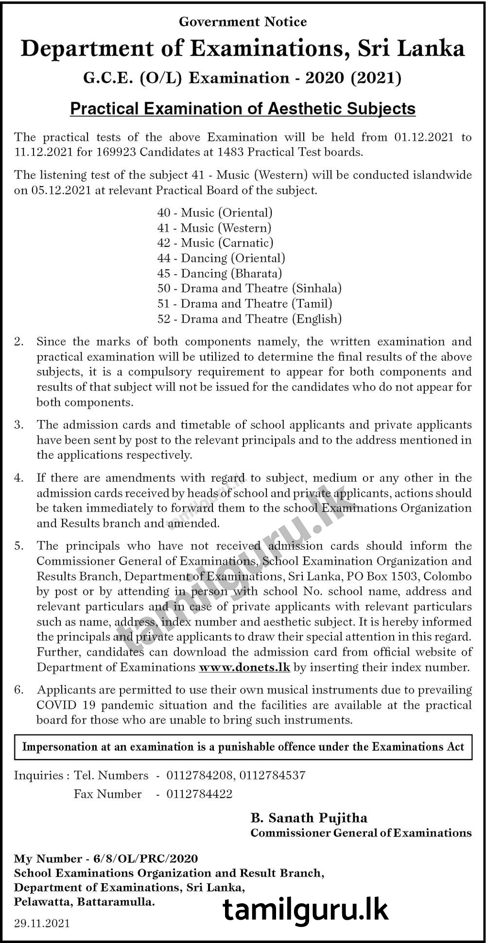 Download Admission Card for Practical Examination of Aesthetic Subjects – G.C.E. (O/L) Examination – 2020(2021)