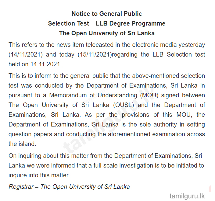 The Open University of Sri Lanka (OUSL) – Special Notice Regarding LLB Selection Test held on 2021-11-14