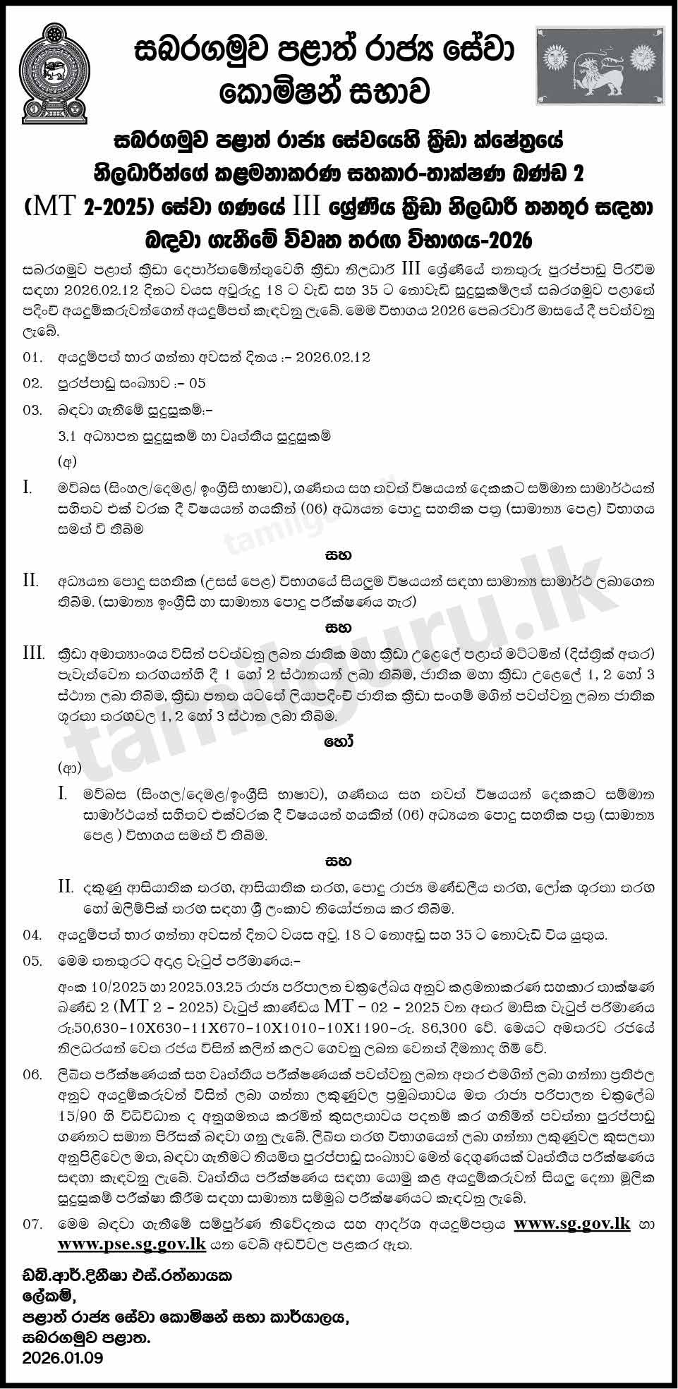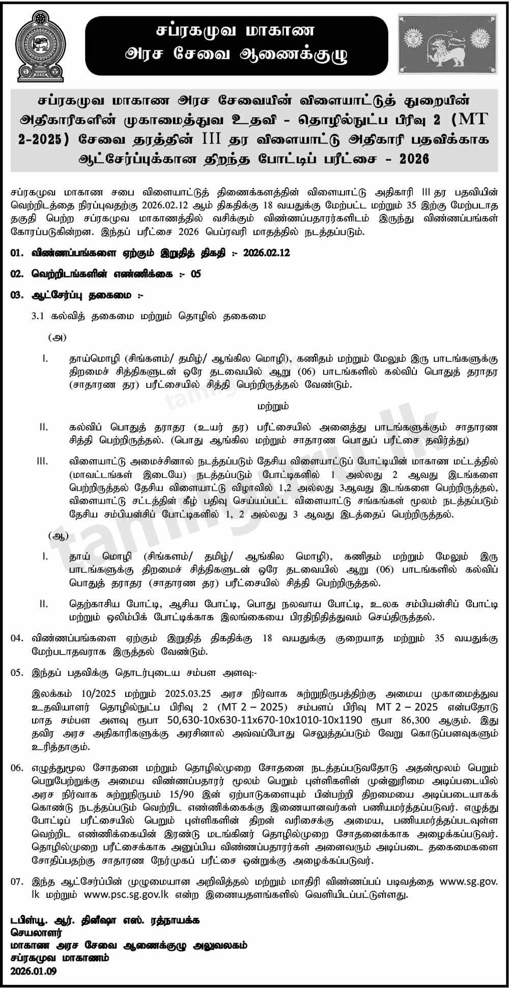 Calling for Applications – Open Competitive Examination for Recruitment to the Post of Sports Officer (Grade III) (Category of Management Assistant Technical Segment 2) in the Sabaragamuwa Provincial Council – 2026