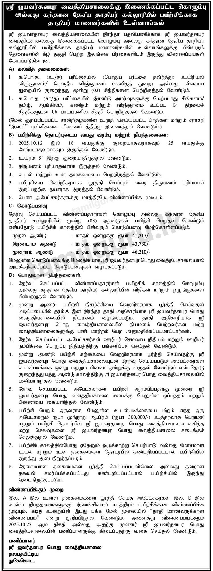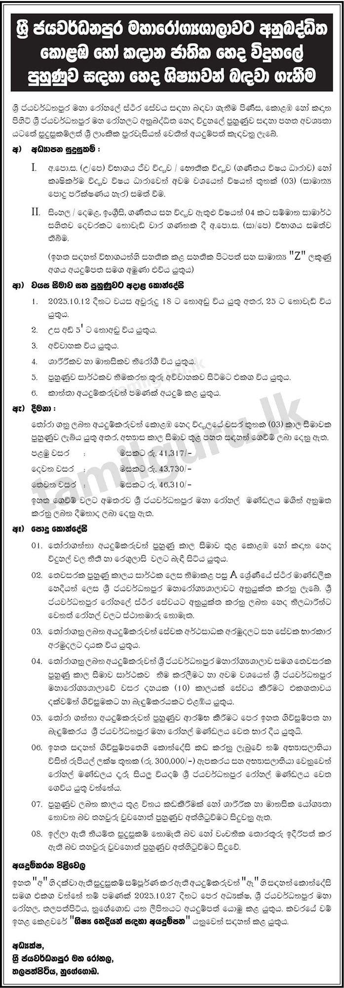 Recruitment of Student Nurses for Training at the National School of Nursing (Colombo or Kandana) Attached to Sri Jayewardenepura General Hospital (SJGH)