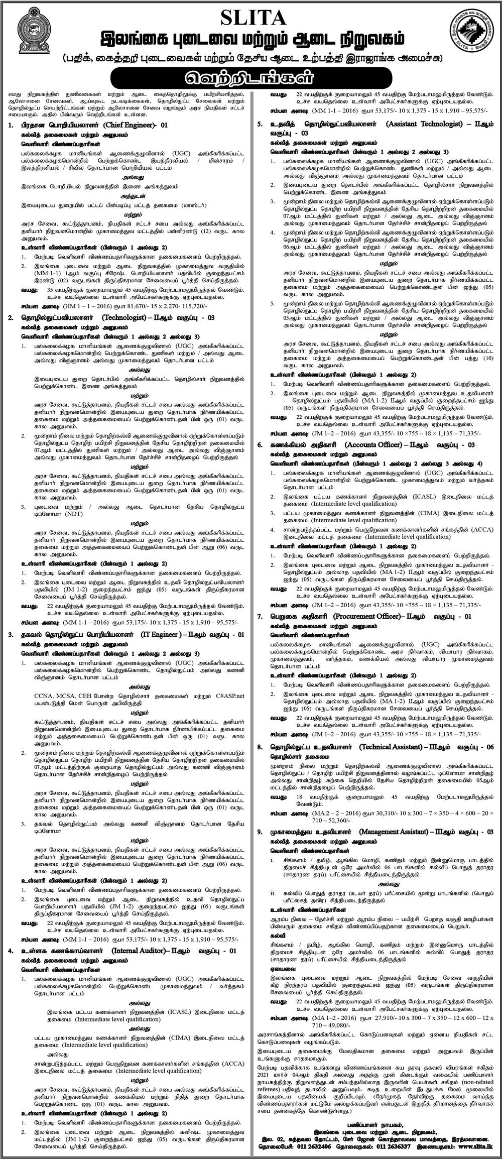 Vacancies at Sri Lanka Institute of Textile and Apparel (SLITA) – 2021
