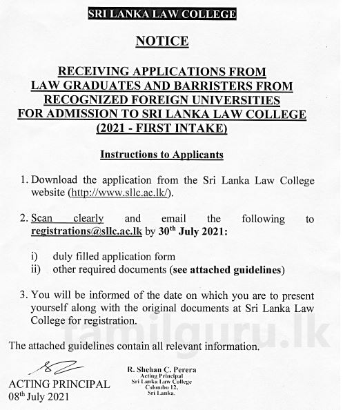 Sri Lanka Law College, 2021 Admission – http://www.sllc.ac.lk