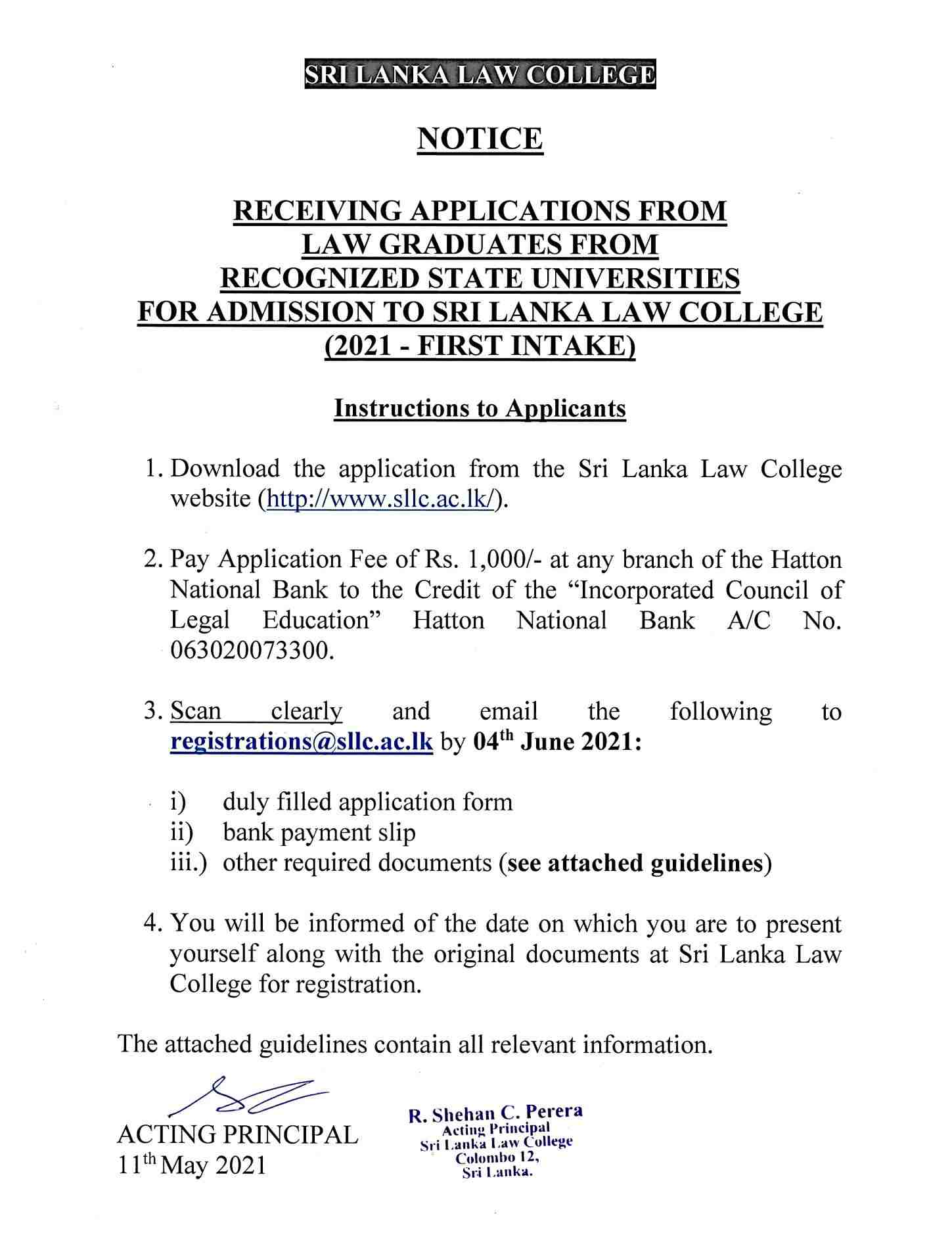 Sri Lanka Law College, 2021 Admission – http://www.sllc.ac.lk