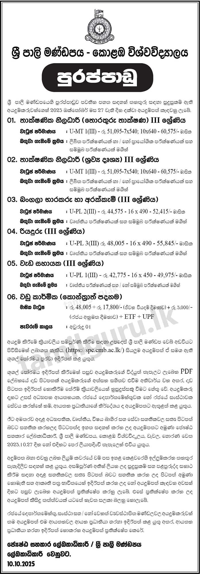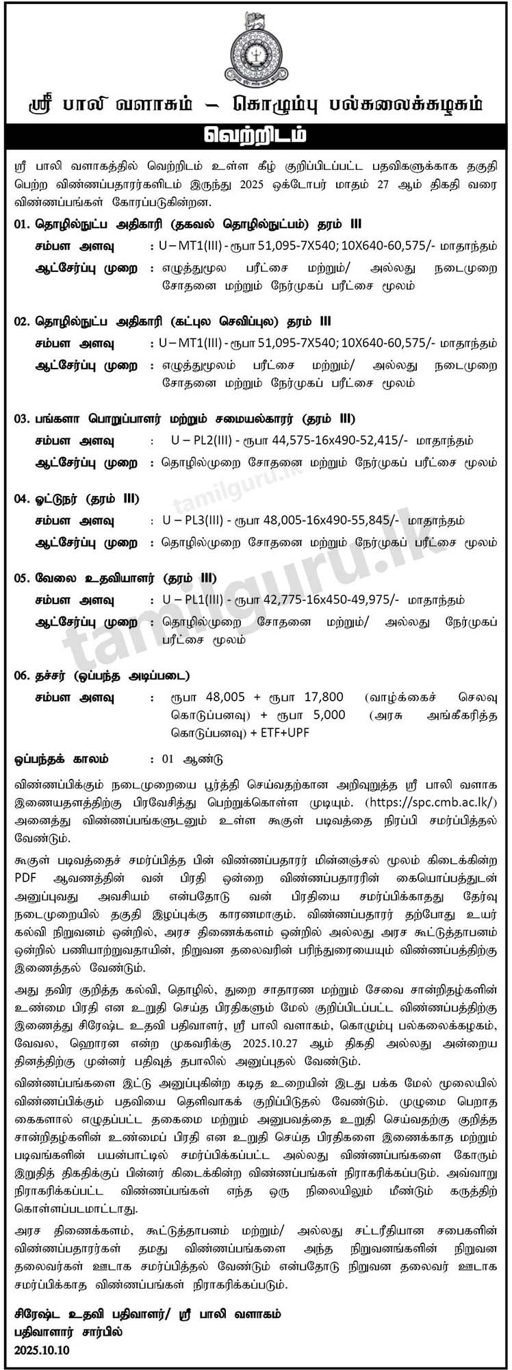 Job Vacancies at Sri Palee Campus, University of Colombo – 2025 October